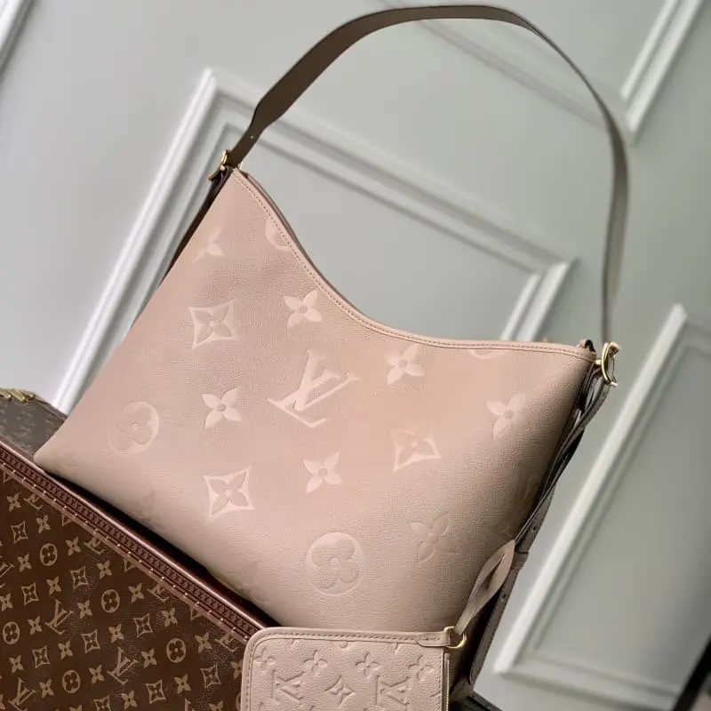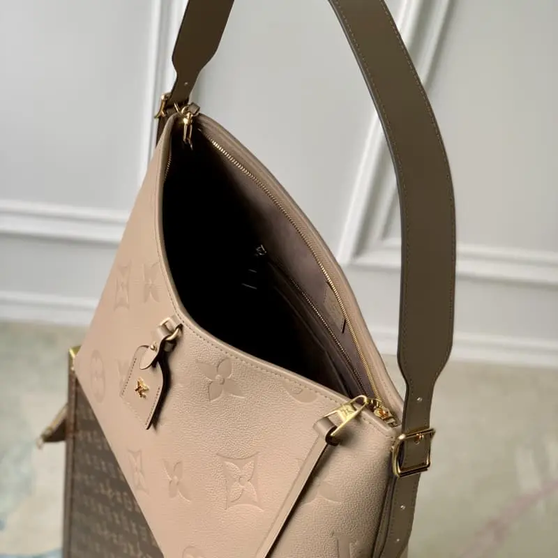 M46289 Elephant Grey CarryAll Medium Handbag Made of Monogram Empreinte embossed leather, the ample structure features a neat inner large pocket to add functional elements. Paired with a Monogram embossed zipper clutch secured with a leather strap. A close companion for urban life. 39 x 30 x 15 cm