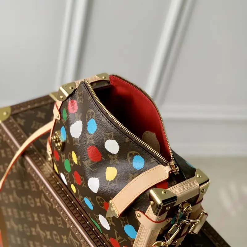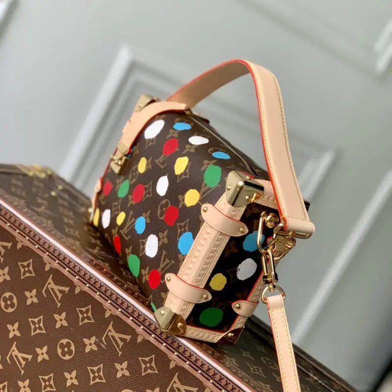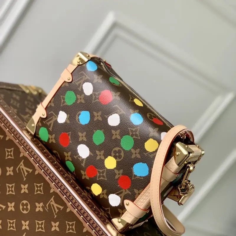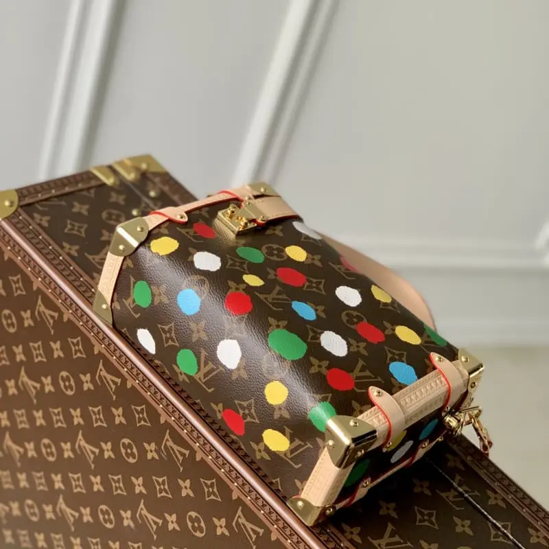 M46396 This LV x YK Side Trunk bag is part of the Lbag x Yayoi Kusama collaboration. The Japanese artist has been defining the forefront of art since the 1960s and has used psychedelic dots as a permanent theme in her paintings, sculptures and installations. This time, she has continued to use Monogram canvas to create a striking three-dimensional effect through silk-screening. 21 x 14 x 6 cm (length x height x width)