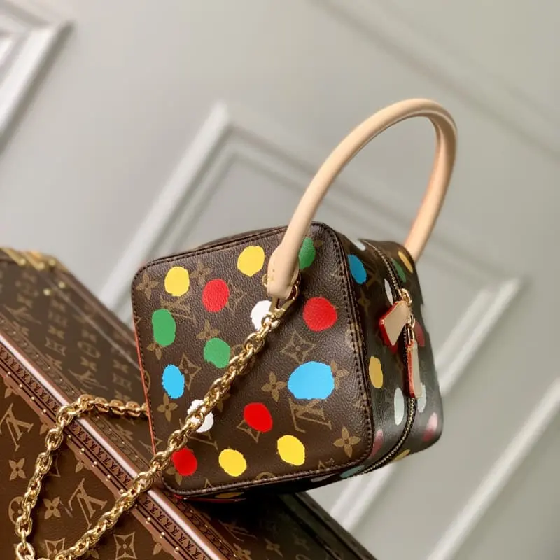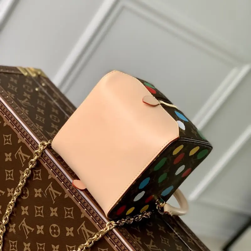 M46450 Lbag x Yayoi Kusama collaboration records the brand’s infinite passion for the art world, which is more evident in the creative silhouette of the LV x YK Square handbag. Japanese artist Yayoi Kusama is obsessed with polka dots and uses them as a permanent theme in her paintings, sculptures and installations. This colorful embellishment of Monogram canvas uses the silk-screen process to reflect the eye-catching three-dimensional texture. 16 x 16 x 16 cm (length x height x width)