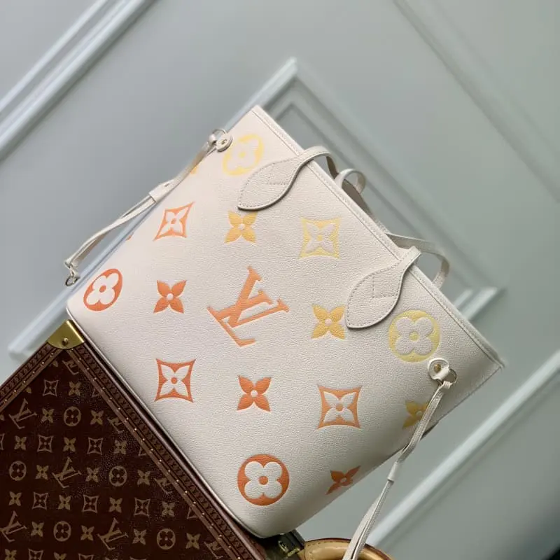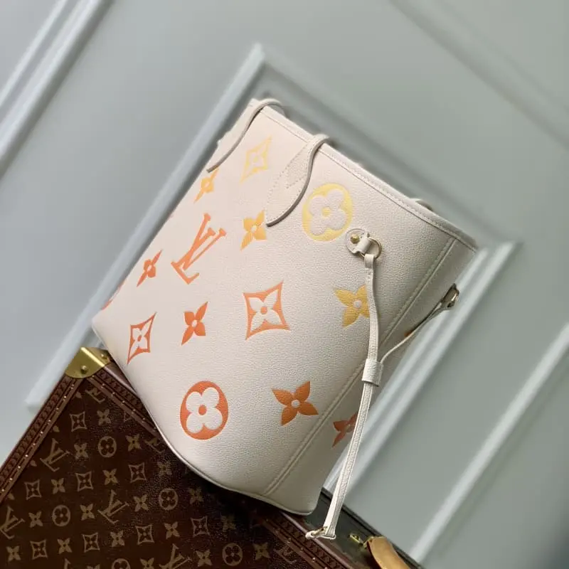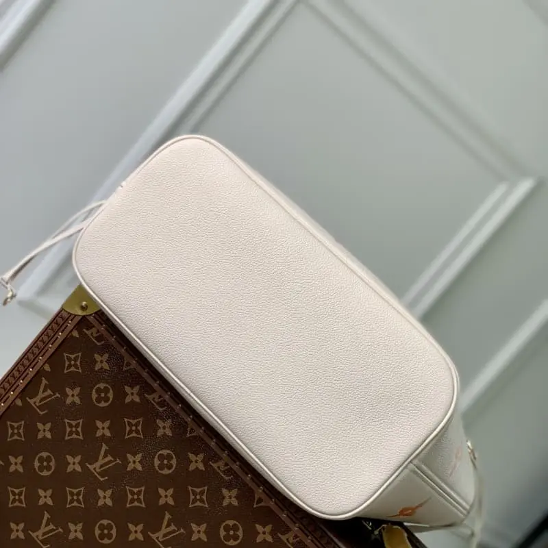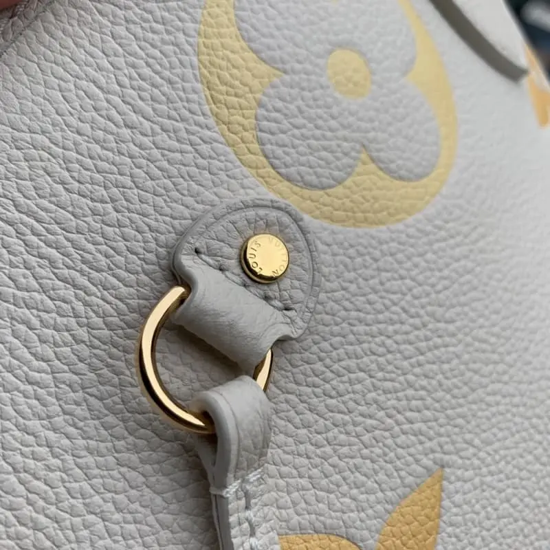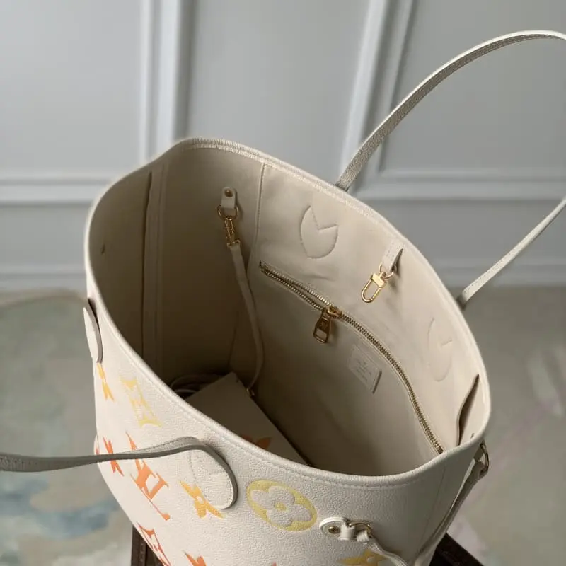 M46516 Beige silk-screen Neverfull medium handbag with Monogram Empreinte leather to convey a soft and graceful charm, with gradient color large LV letters and Monogram flowers on it. Untie the side straps to instantly transform the compact configuration into a casual tote bag. The detachable zipper pocket is made of Monogram Empreinte leather and is suitable for storing valuables. 31.0 x 28.0 x 14.0 cm (length x height x width)