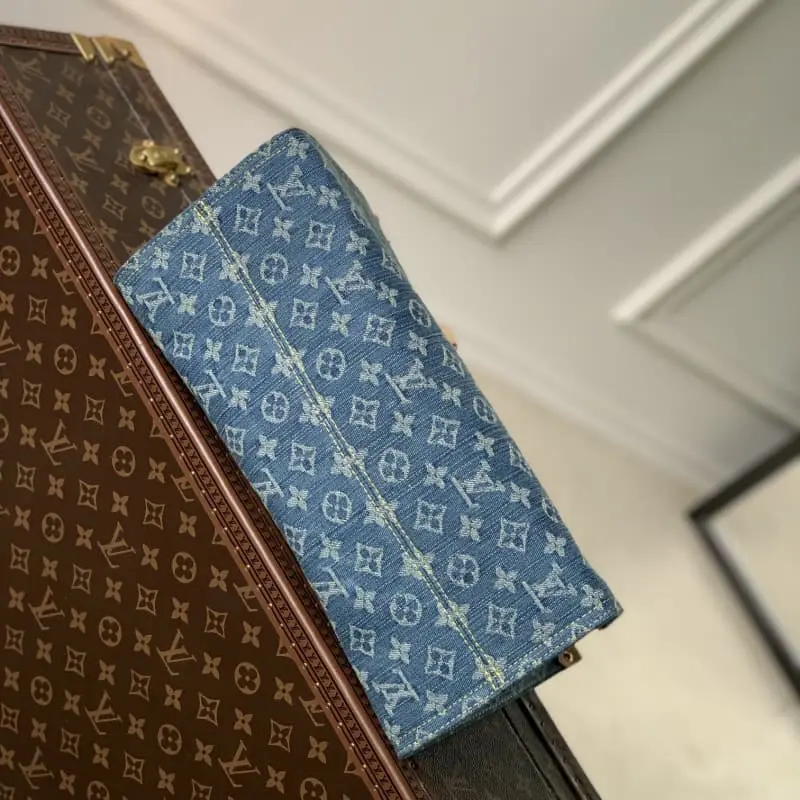 M46871 Blue Denim Square Bag Series Onthego Medium Handbag Blue (Denim) This Onthego Medium Handbag is renovated with stonewashed Monogram jacquard denim with leather trim and contrast stitching. Ample capacity to meet business or leisure needs Delicate handles and long shoulder straps unlock multiple carrying methods. Dimensions 35.0 x 27.0 x 14.0 cm