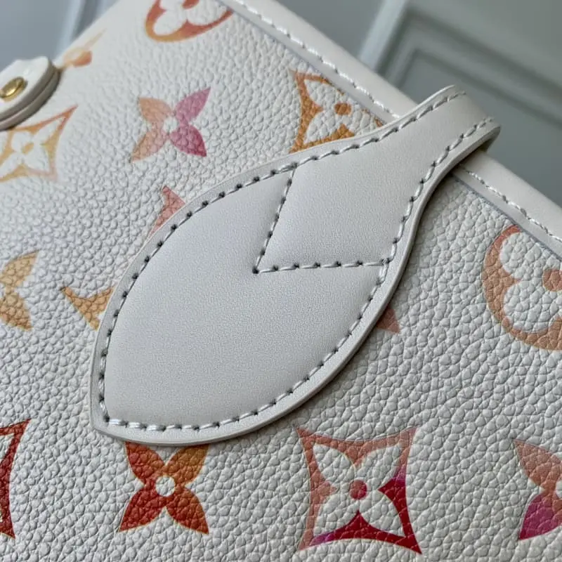 M47080 This Neverfull medium tote is made of Monogram Empreinte Sunrise Aquarelle leather. The Monogram embossing is printed in a joyful gradient and then silk-screened to create a sophisticated sheen that resembles morning dew. 31 x 28 x 14 cm (length x height x width)