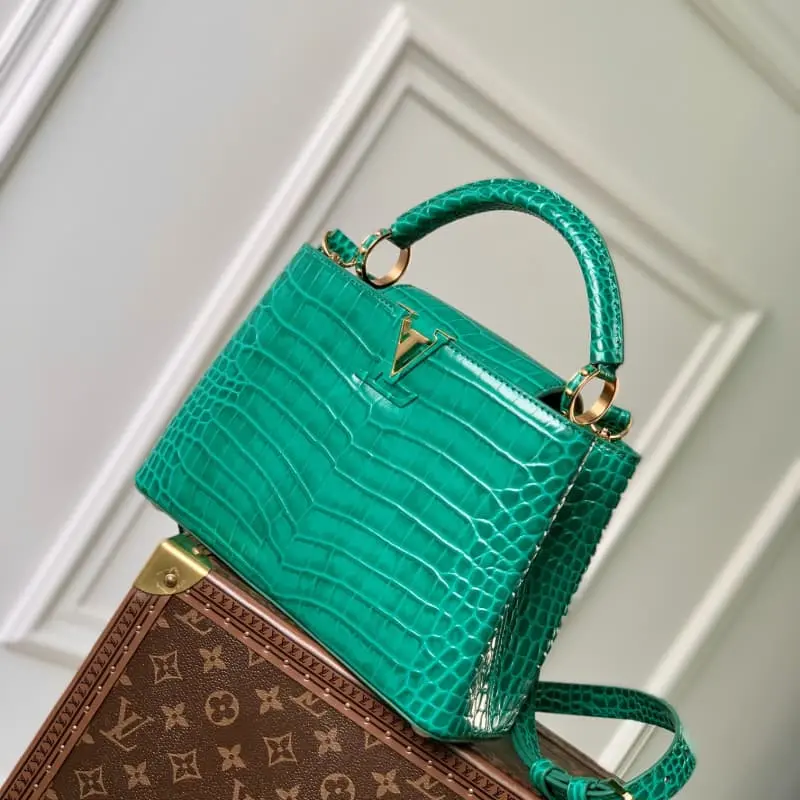 M48865 Green Small Capucines BB Handbag French imported calfskin, shiny metal accessories, unique Capucines flap can be put inside the bag to display the letter logo, and can be turned out to show the Monogram Flower pattern size: 27 x 18 x 9cm