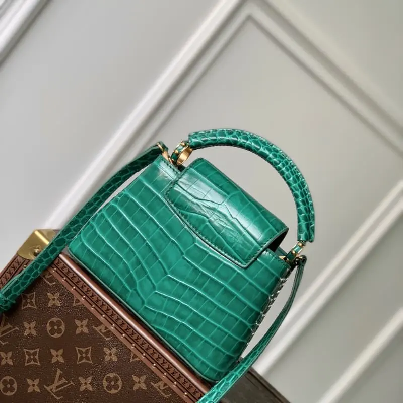 M48865 Green Mini Capucines Mini Handbag French imported calfskin, shiny metal accessories, unique Capucines flap can be put inside the bag to display the letter logo, or turned out to show the Monogram Flower pattern size: 21x14x8 cm