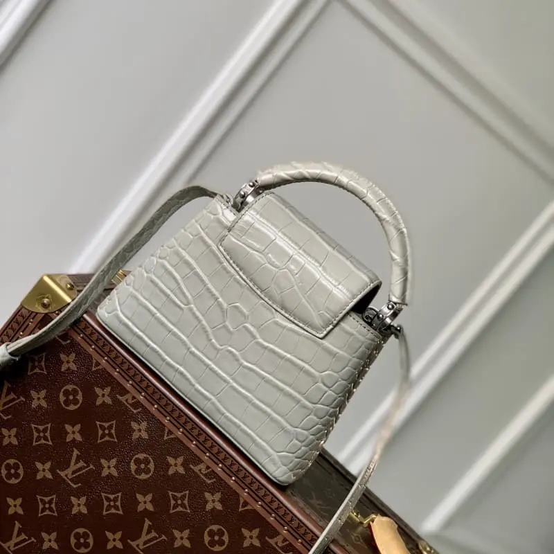 M48865 Grey Mini Capucines Mini Handbag French imported calfskin, shiny metal accessories, unique Capucines flap can be put inside the bag to display the letter logo, or turned out to show the Monogram Flower pattern size: 21x14x8 cm