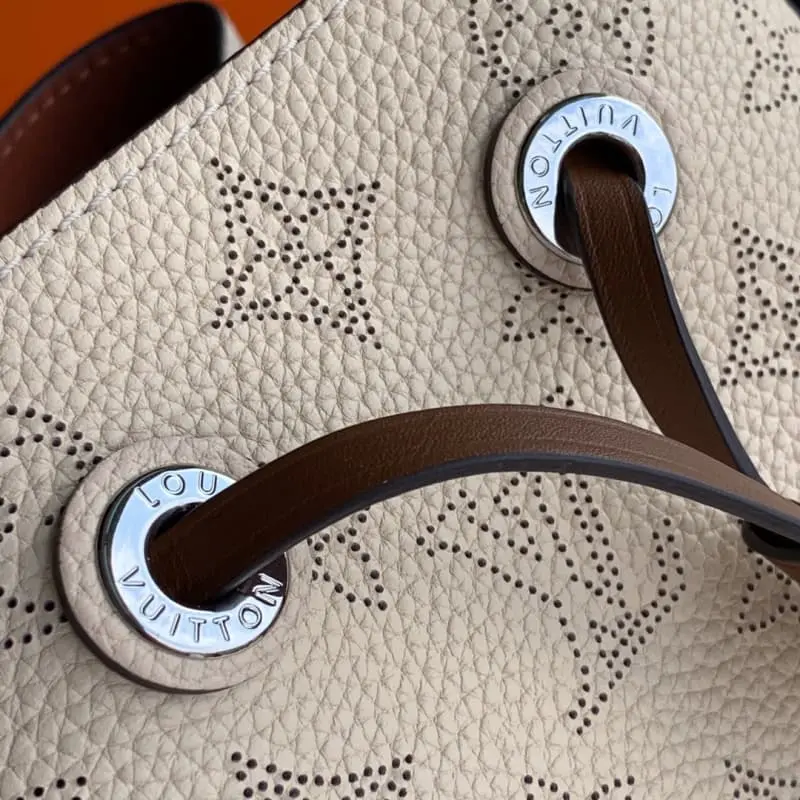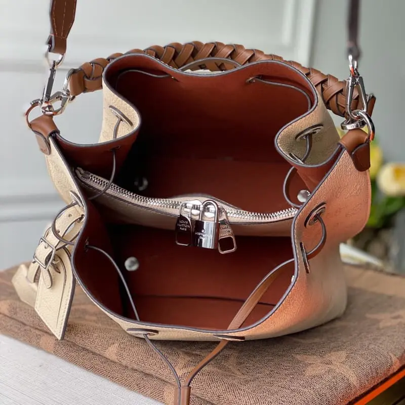 Muria bucket bag is made of perforated calfskin with perforations that slowly outline the Monogram pattern to embellish the brand and key bag. It is paired with a braided handle and a long leather shoulder strap. Dimensions: 25.0 x 25.0 x 20.0 cm (length x height x width).