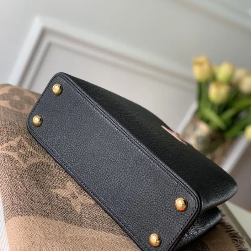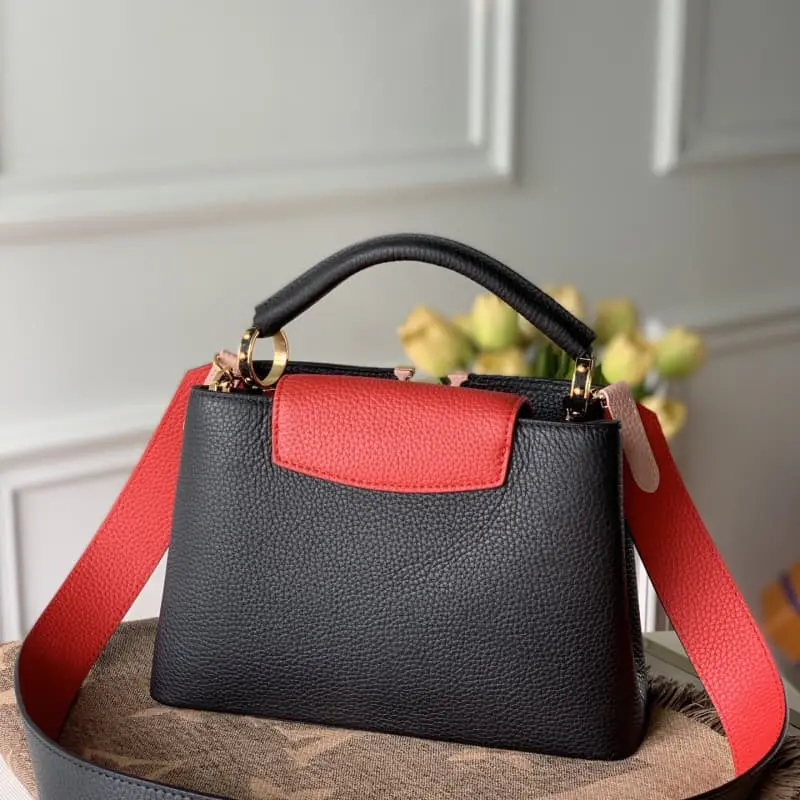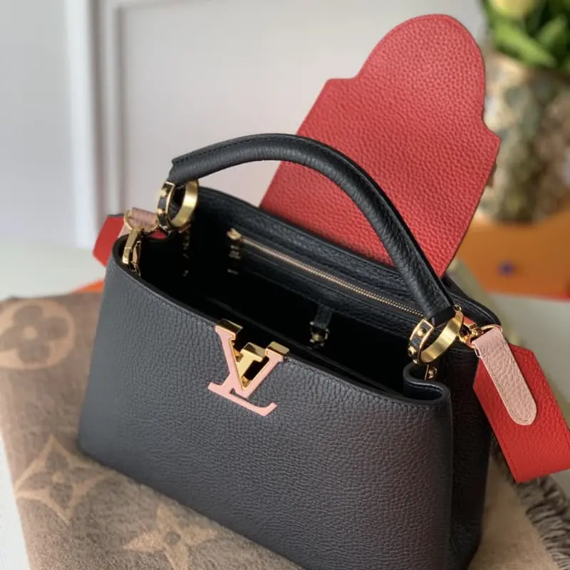 original M57518 Capucines BB handbag is designed with modern colors to create a distinctive and elegant fashion work. The design is made from full-grain Taurillon leather and features wide shoulder straps for a fresh, youthful feel. The handbag has a variety of fashionable carrying methods. It has a handle for hand-carrying or arm-carrying, and can be carried on the shoulder or crossbody. Dimensions: 27.0 x 18.0 x 9.0 cm.