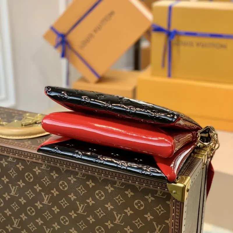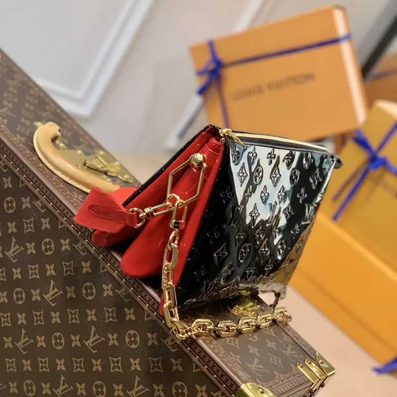 The M57793 patent leather black Coussin small handbag shines on the 2021 Spring/Summer fashion show. The Monogram embossed fluffy sheepskin creates a pillow configuration that injects avant-garde style into the simple design. It can be carried cross-body or transformed into a chain baguette bag using the shoulder strap. Detailed features 26 x 20 x 12 cm (length x height x width) Monogram embossed fluffy sheepskin Calfskin trim Microfiber lining Metal parts Inner compartment Zipper closure Shoulder strap: Removable Adjustable strap half length: 30.0 cm Strap half length can be adjusted to: 50.0 cm Chain: Removable chain half length: 27.0 cm