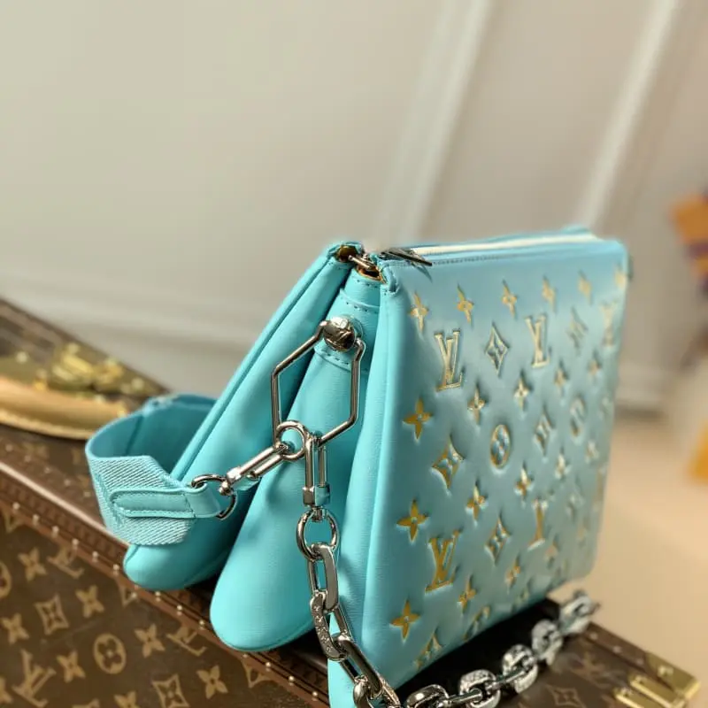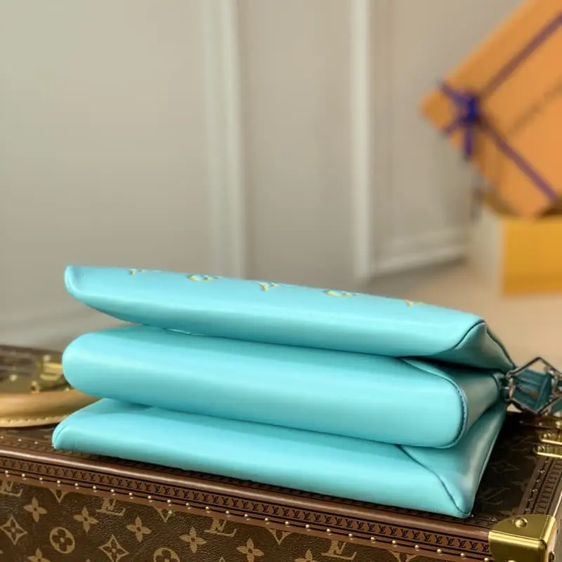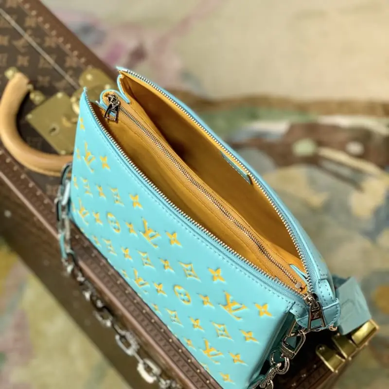 The light blue Coussin Small M57793 made a splash at the 2021 Spring/Summer fashion show. The Monogram embossed fluffy sheepskin cushion shape injects an avant-garde style into the simple design. It can be carried cross-body or transformed into a chain baguette bag using the shoulder strap. Detailed Features 26 x 20 x 12 cm (length x height x width) Monogram embossed fluffy sheepskin Calfskin trim Microfiber lining Metal parts Inner compartment Zipper closure Shoulder strap: Removable Adjustable strap half length: 30.0 cm Strap half length can be adjusted to: 50.0 cm Chain: Removable chain half length: 27.0 cm