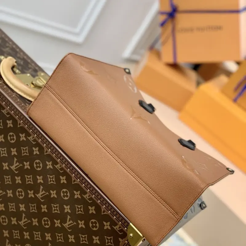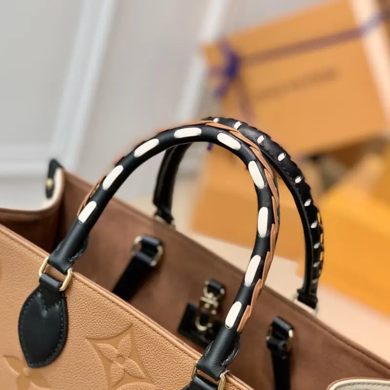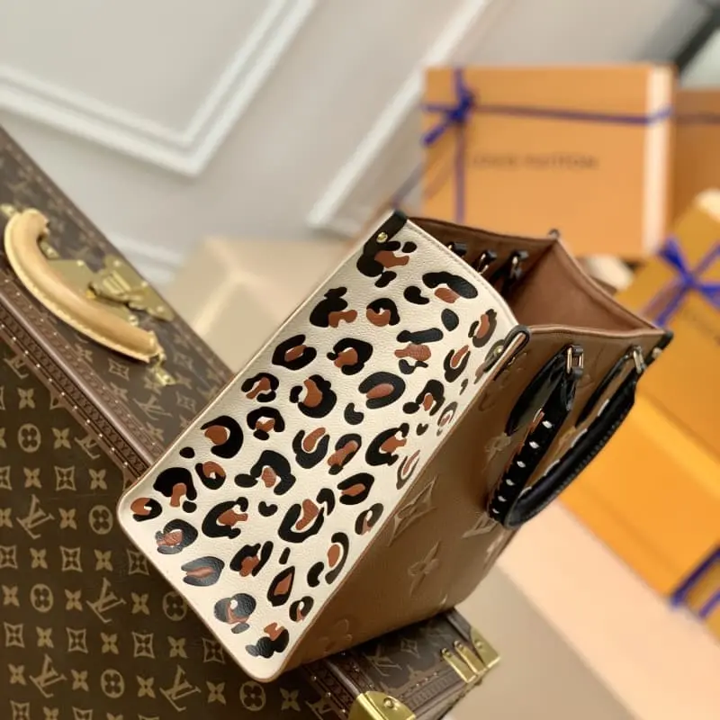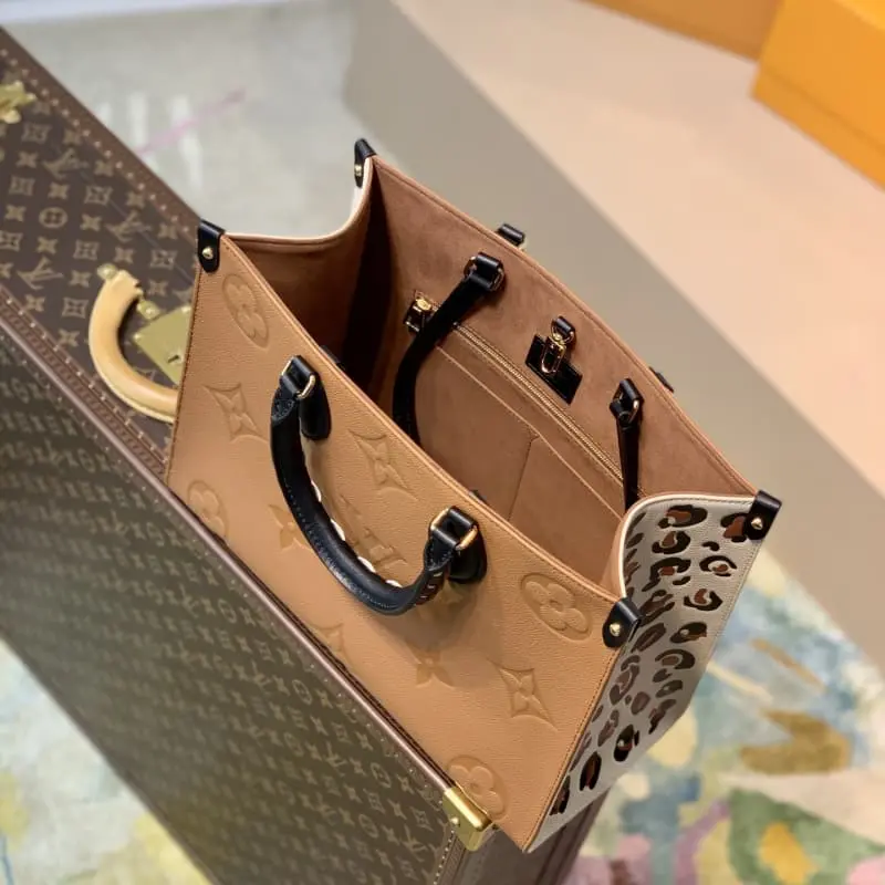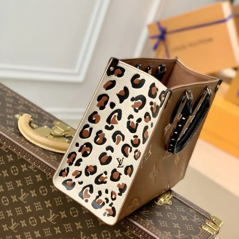 M58521 Brown This Onthego medium handbag is from the 2021 Fall Wild at Heart capsule collection. It is embossed with Monogram Empreinte leather. The shiny Monogram pattern is embellished with leopard prints on both sides. The braided handles and long shoulder straps allow for a variety of carrying methods. There is ample space to easily store daily necessities. Size: 35x27x14cm.