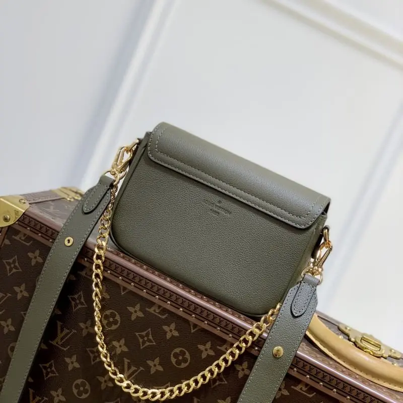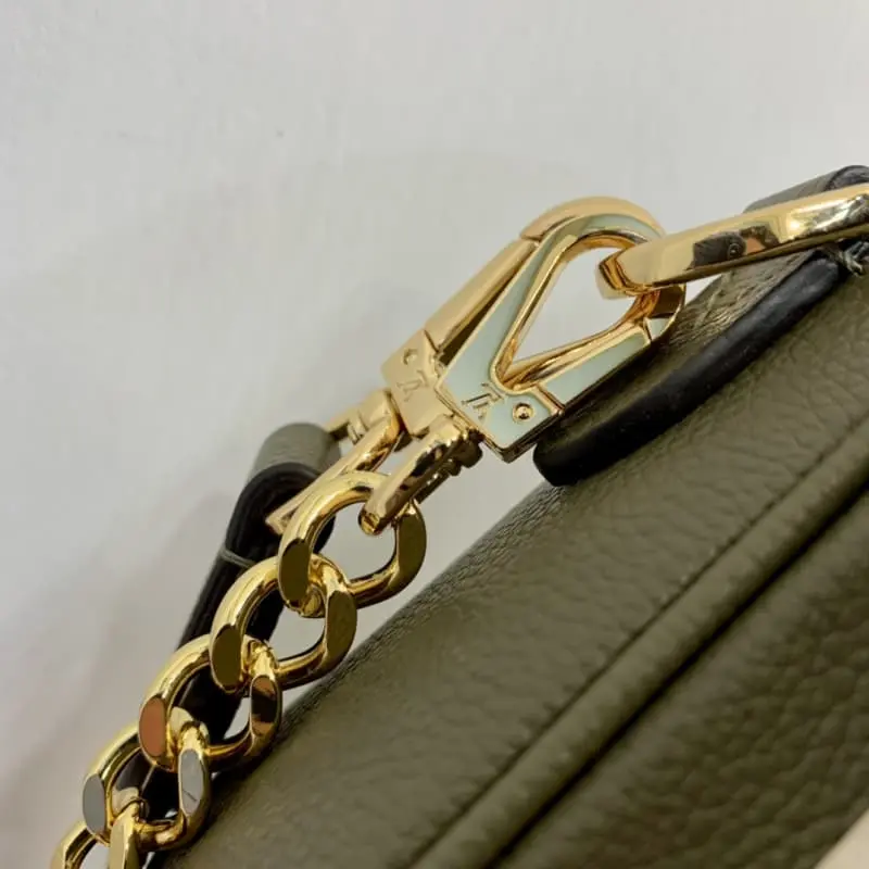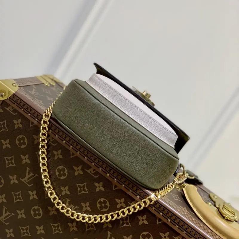 M58557 Dark Green 59733) Lockme Tender handbag is made of soft grained cowhide leather. Its metal D-ring can hang personalized accessories. The detachable and adjustable wide shoulder strap adds practical details to the traditional chain. Dimensions: 19.0 x 13.0 x 8.0 cm (length x height x width)