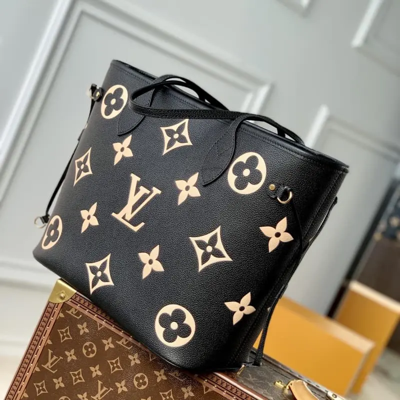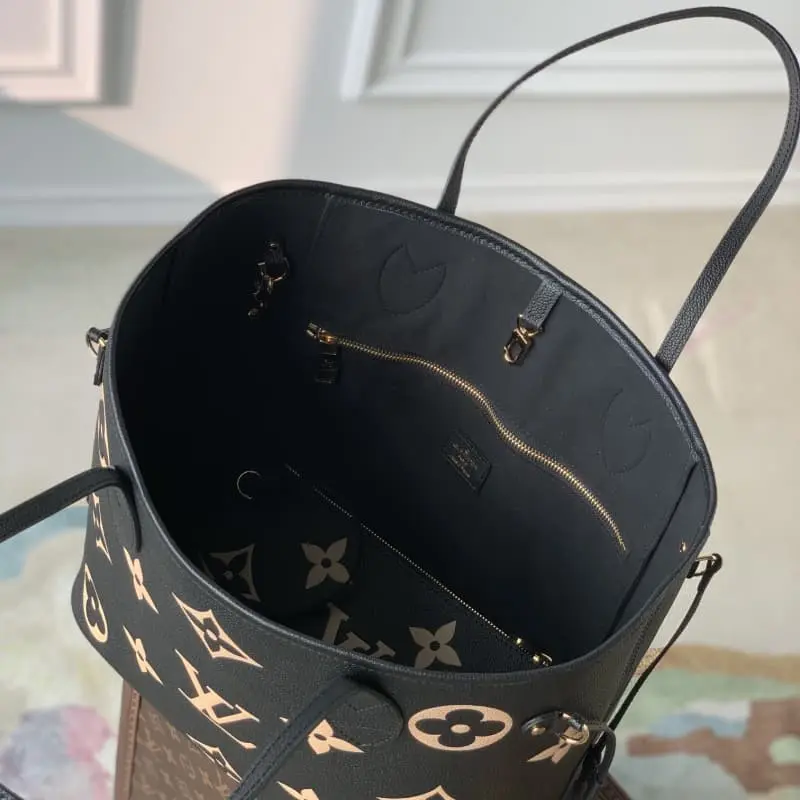 M58907. This medium Neverfull bag features a Monogram pattern on cowhide leather, first embossed and then printed. The side drawstrings transform the tote into an elegant urban bag; the long handles make it easy to carry on the shoulder or by the elbow. Dimensions: 31.0 x 28.0 x 14.0 cm (L x H x W)