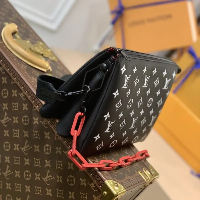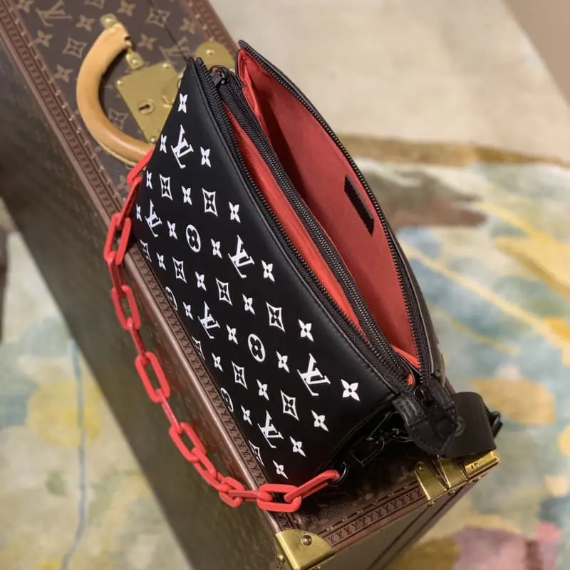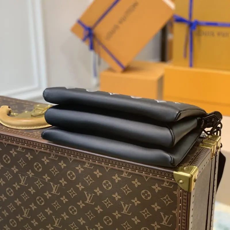 M59398 Black This small Coussin bag is made of fluffy sheepskin leather with embossed Monogram pattern, matte metal parts and resin chain. The soft shape fits the body rhythm chain and wide fabric shoulder strap to achieve shoulder and crossbody experience. Dimensions: 26.0 x 20.0 x 12.0 cm (length x height x width)