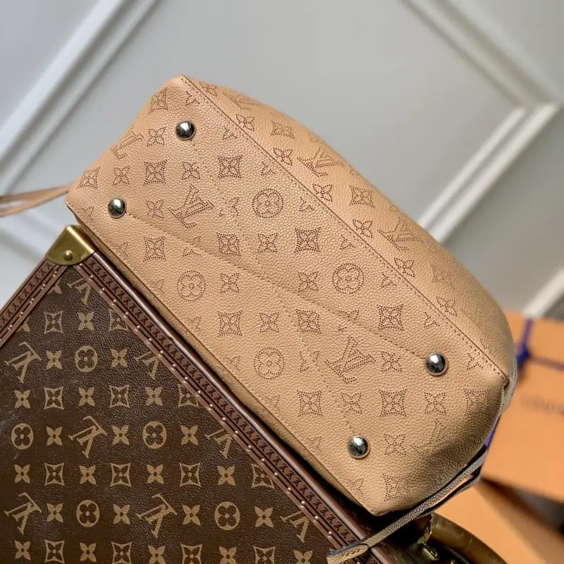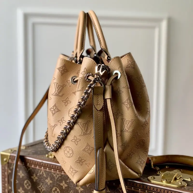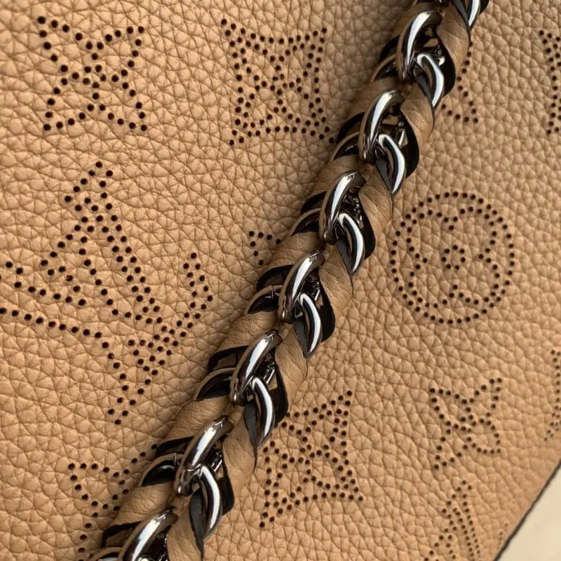 Original M59655 orange Bella Tote handbag made of soft perforated cowhide leather with gentle pleats and drapes, embellished with jewelry-like chains. The ample structure has a neat inner layer to meet the needs of daily travel and can inject modern charm into casual wear. Dimensions: 32.0 x 23.0 x 13.0 cm (length x height x width)