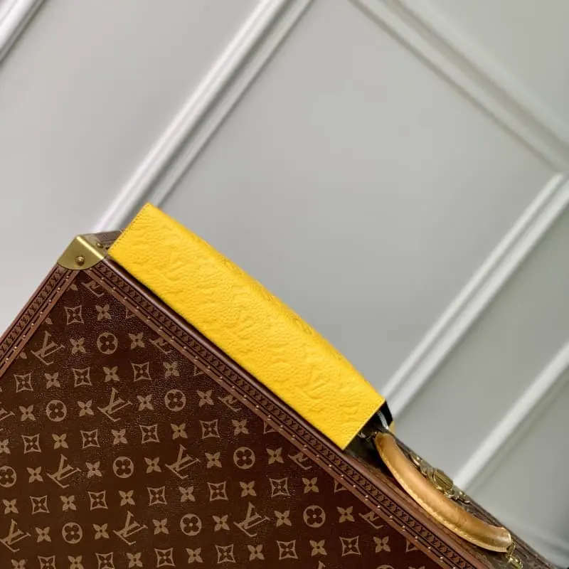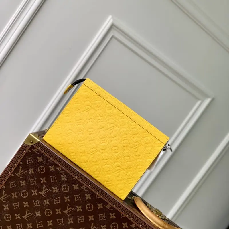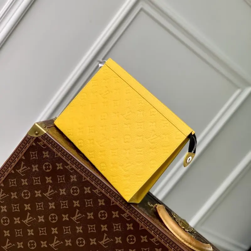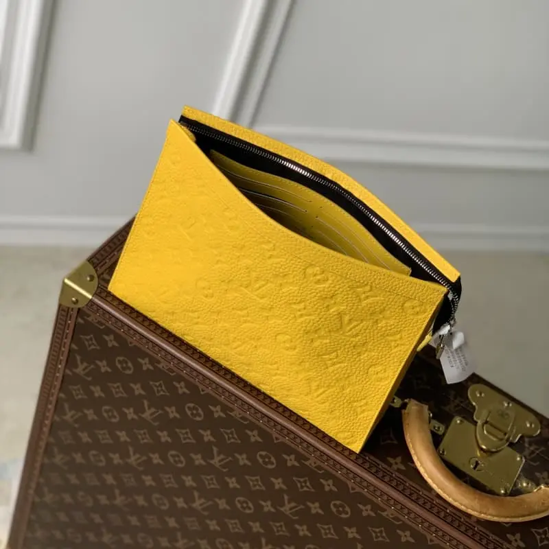 M61692 Embossed yellow! Chip version of the Pochette Voyage clutch This Pochette Voyage clutch is made of Taga lychee leather with LV monogram on one corner and shiny metal parts. The zippered card slot and main compartment can accommodate small items. Detailed features! 27 x 21 x 6 cm, (length x height x width)