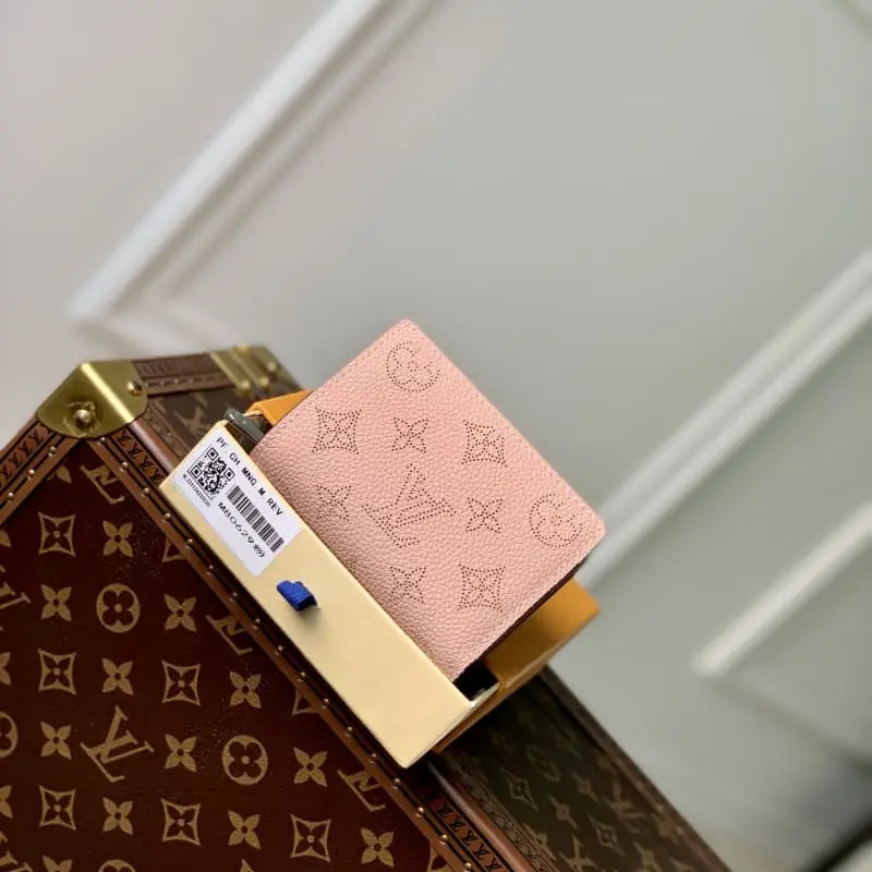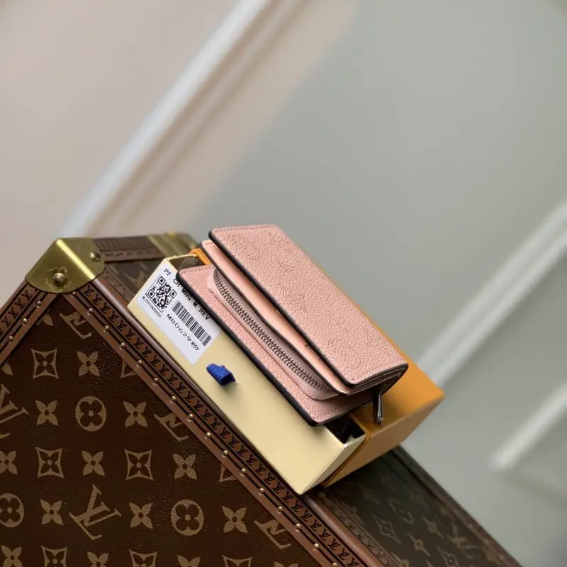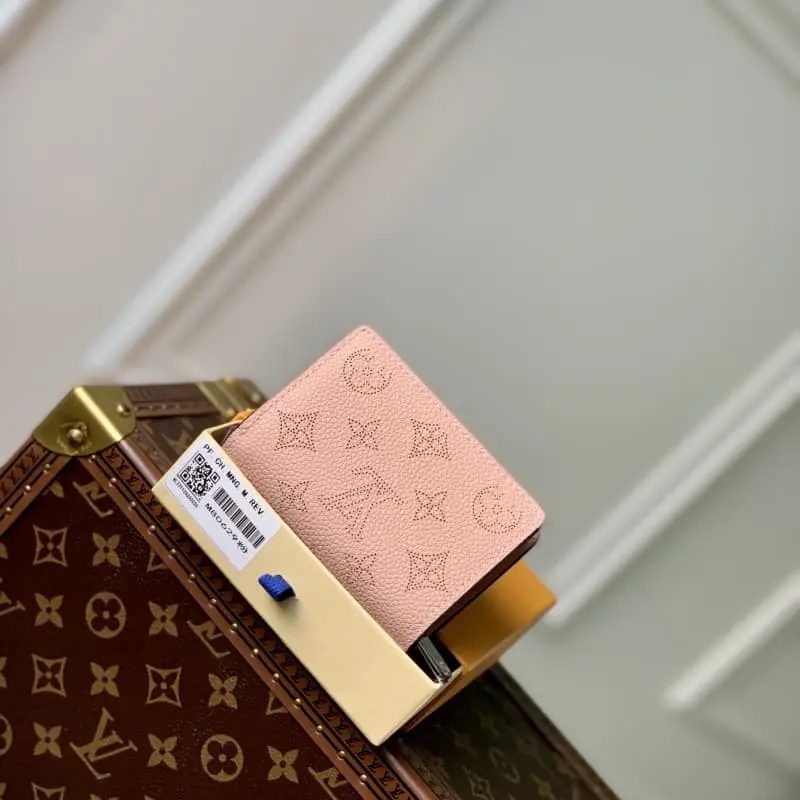 M80629 Pink Made of soft Mahina leather with the iconic Monogram pattern, the elegant and compact design is the charming “Portefeuille Claire”. There is a zippered coin pocket on one side and 6 card slots on the other. There is a compartment on the back for unfolded banknotes. Size: 11??8.5??3.5