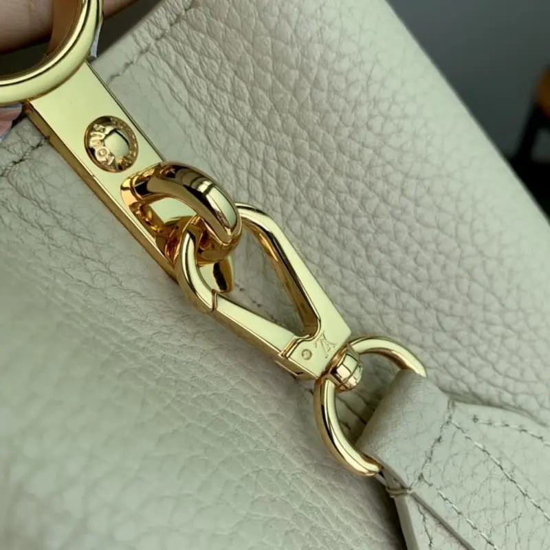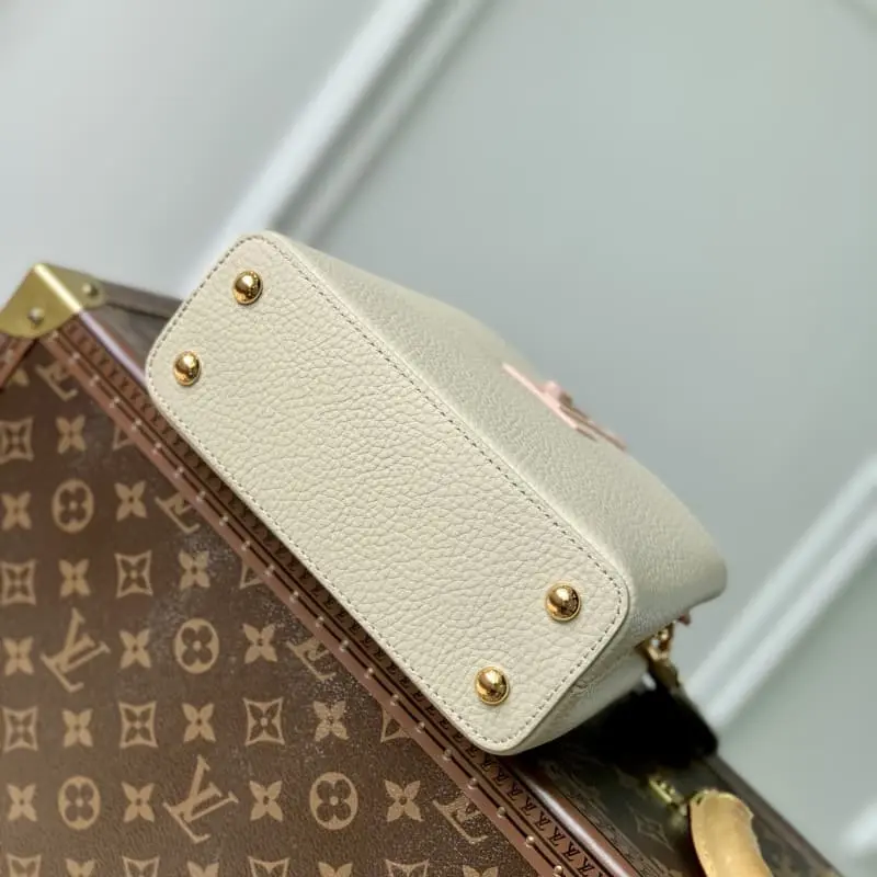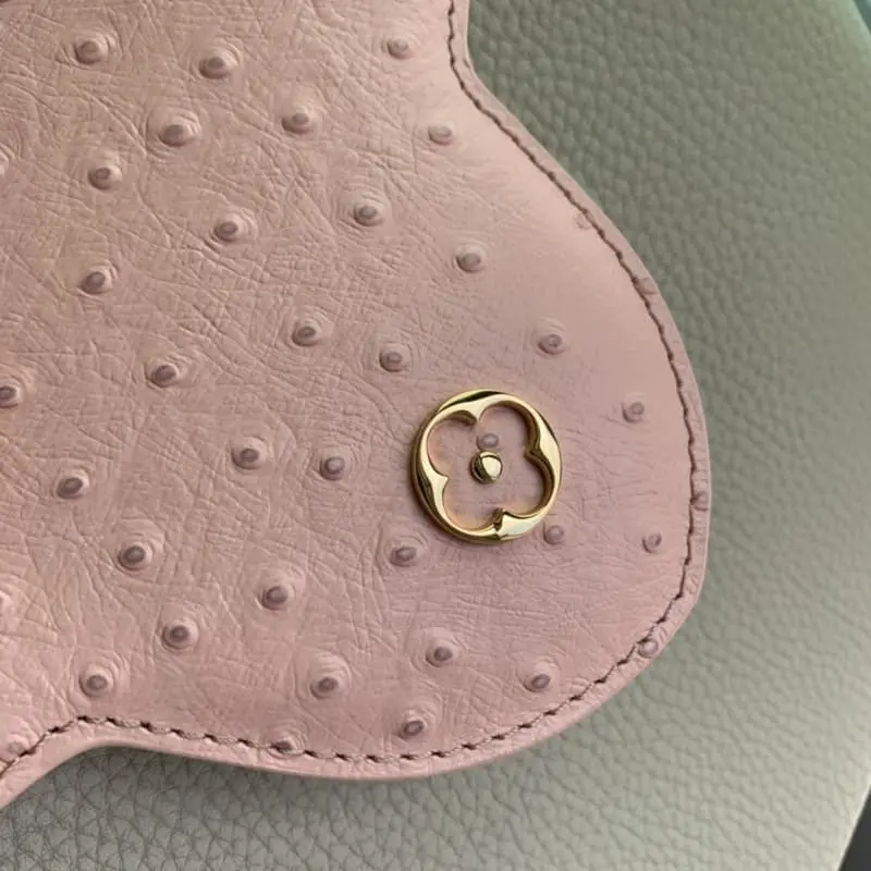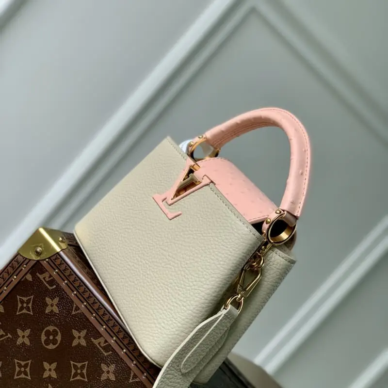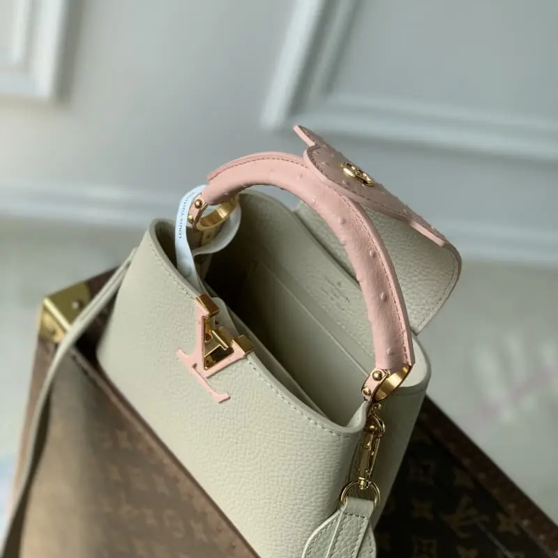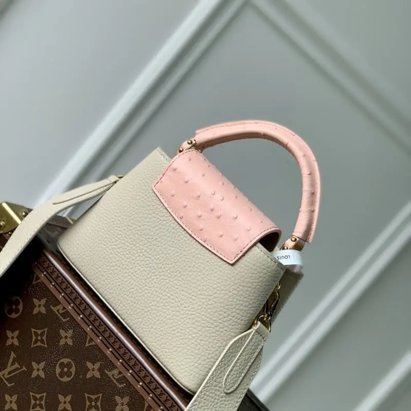 M81409 This medium Capucines bag is crafted in Taurillon leather with a sleek silhouette and ostrich leather covering the flap, handles and LV monogram. The flap can be opened or closed to read the LV logo, and the removable wide leather shoulder strap adds a modern touch. Medium: size:31.5??20??11cm Small: size:27??18??9cm Mini: size:21x14x8cm