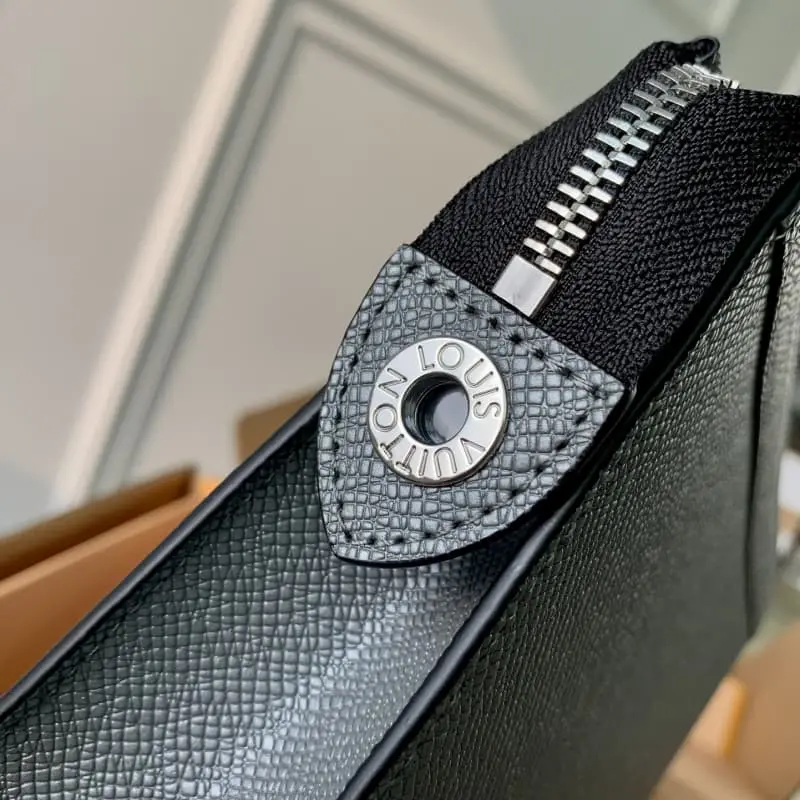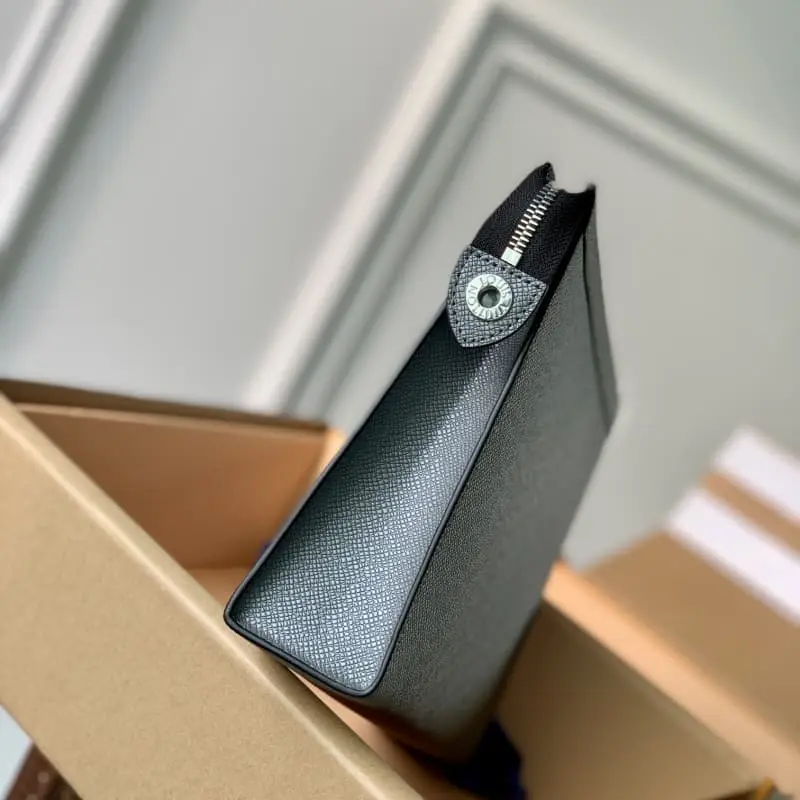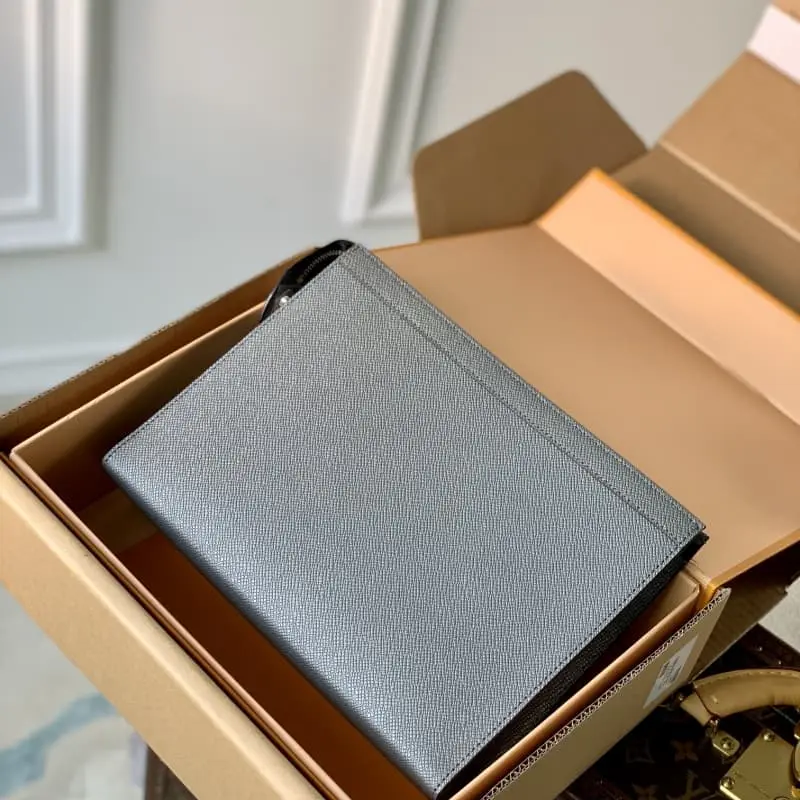 Upgraded version M81556 Grey! POCHETTE VOYAGE Clutch This Pochette Voyage Clutch is made of Taga grained cowhide leather with LV monogram on one corner and shiny metal parts. The zippered card slot and main compartment can hold small items. Detailed features! 27 x 21 x 6 cm, (length x height x width), Taga cowhide leather, fabric lining, metal parts, zipper closure, inner patch pocket, card compartment, this product is made in France, Spain, Italy and the United States.