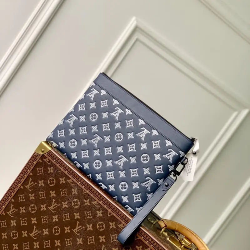 M81570 Elegant blue new season POCHETTE TO-GO clutch! This Pochette To-Go clutch is made of elegant Monogram Shadow embossed cowhide leather. It has a zipper and plenty of space to store receipts, mobile phones and other personal items. It can also be used with a detachable wrist strap. 30 x 21.5 x 1 cm (length x height x width)