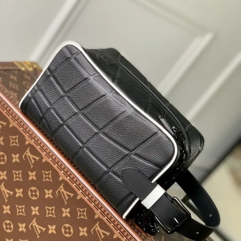 M81849 black full leather toiletry bag Clutch collection cloakroom dopp kit Clutch cloakroom dopp kit Handbag from the season 2 capsule collection Full leather ball pattern lychee pattern chain clutch toiletry bag toiletry bag. Adjustable leather wrist strap can also be hung on a hook. Dimensions: 15 x 24 x 15 cm