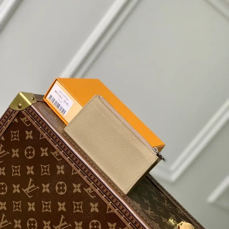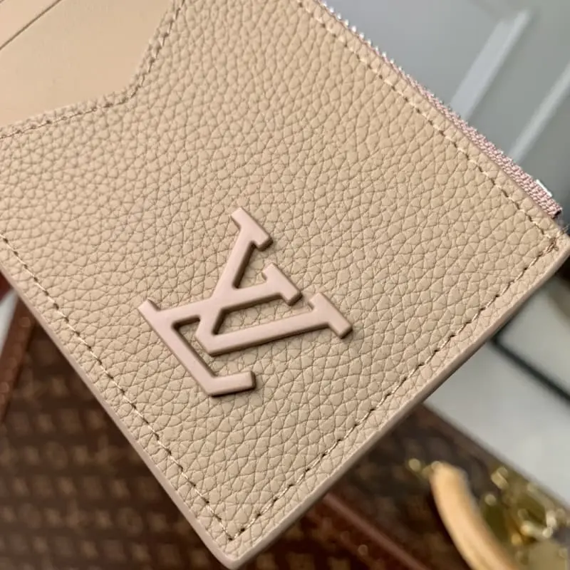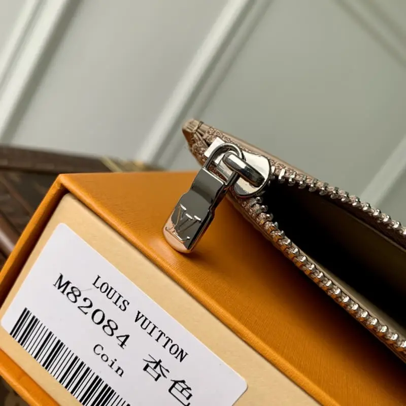 M82084 Apricot “coin card holder” made of beautiful cowhide with grain (shibo). The matte LV initials are decorated in the same color as the “LV AEROGRAM” series. In addition to the 4 card slots and zippered compartment for coins, there is also a compartment for bills and receipts. Dimensions: 8 x 14.5 x 1 cm