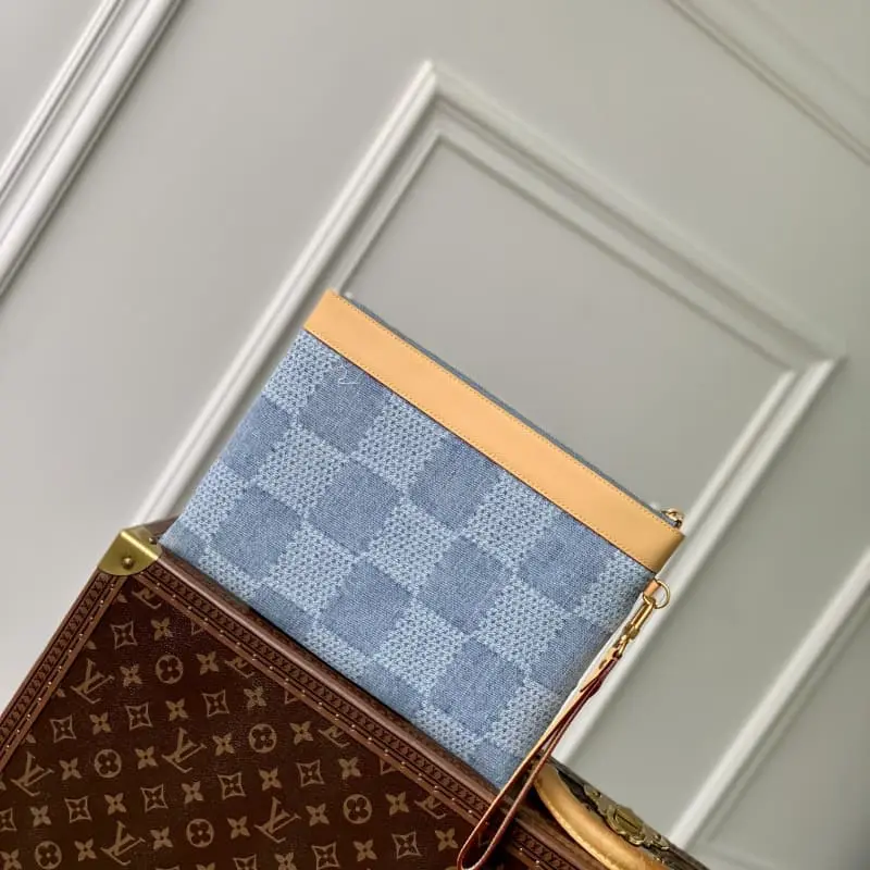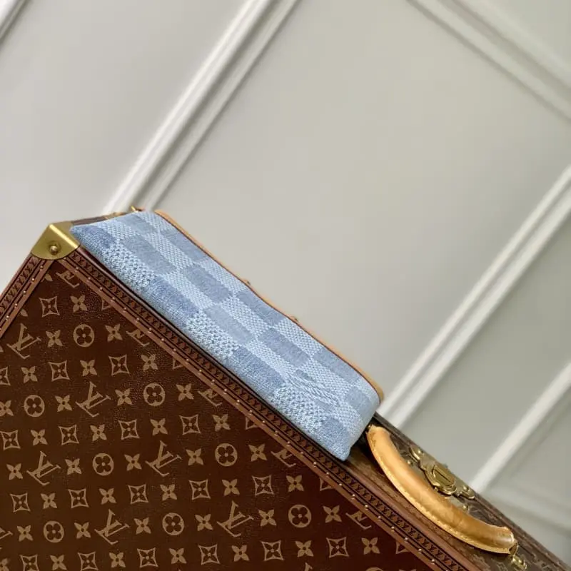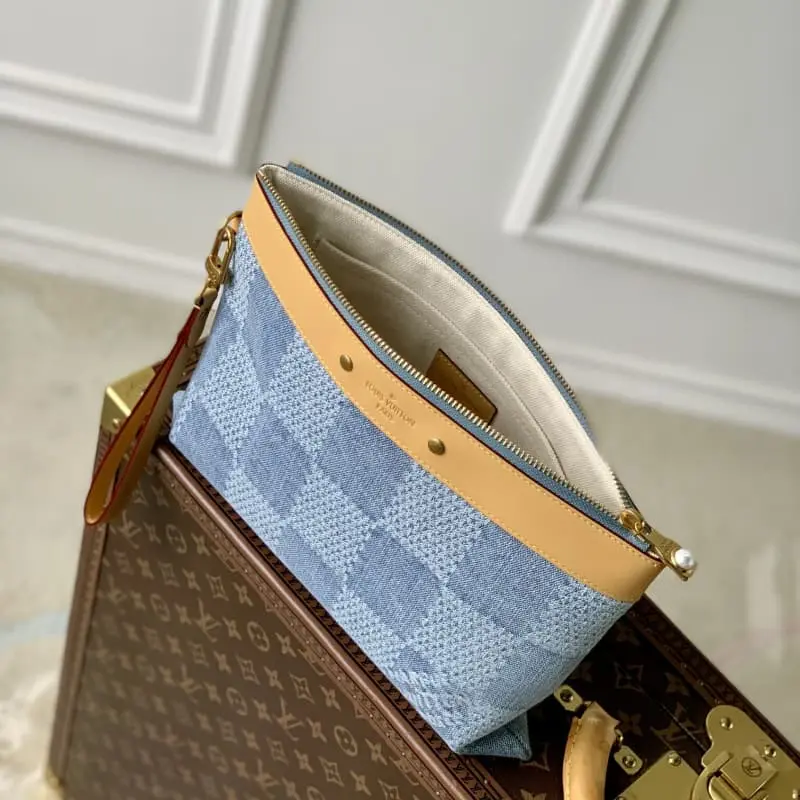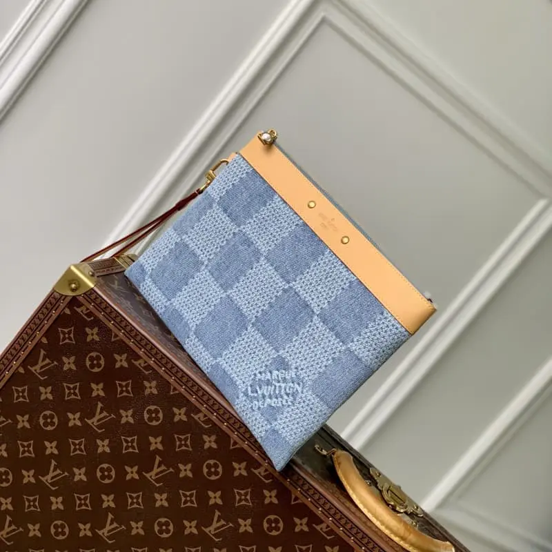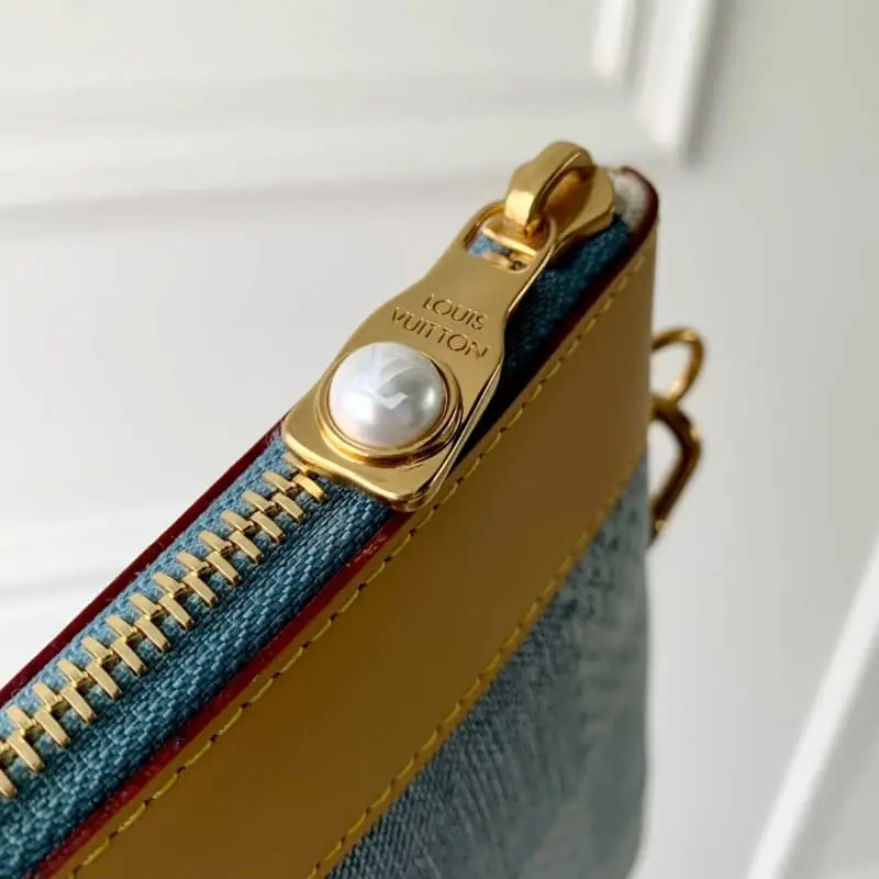 M82313 “Pochette to Go” has a texture like vintage jeans from the 1970s. The Monogram pattern with Deboss processing is highlighted in dark blue. The faded denim is finished with Monogram Wash denim canvas. Inspired by the design quoted from the archives, the label with the “Lbag” signature is also attractive. Size: 30 21.5 1