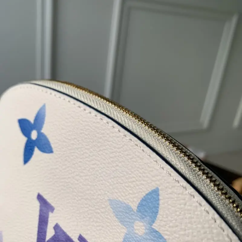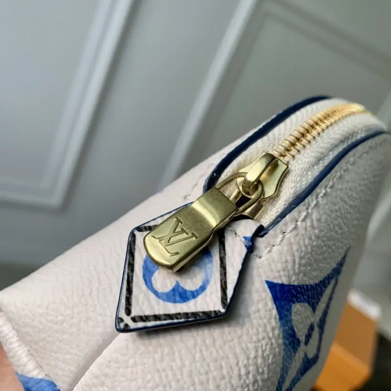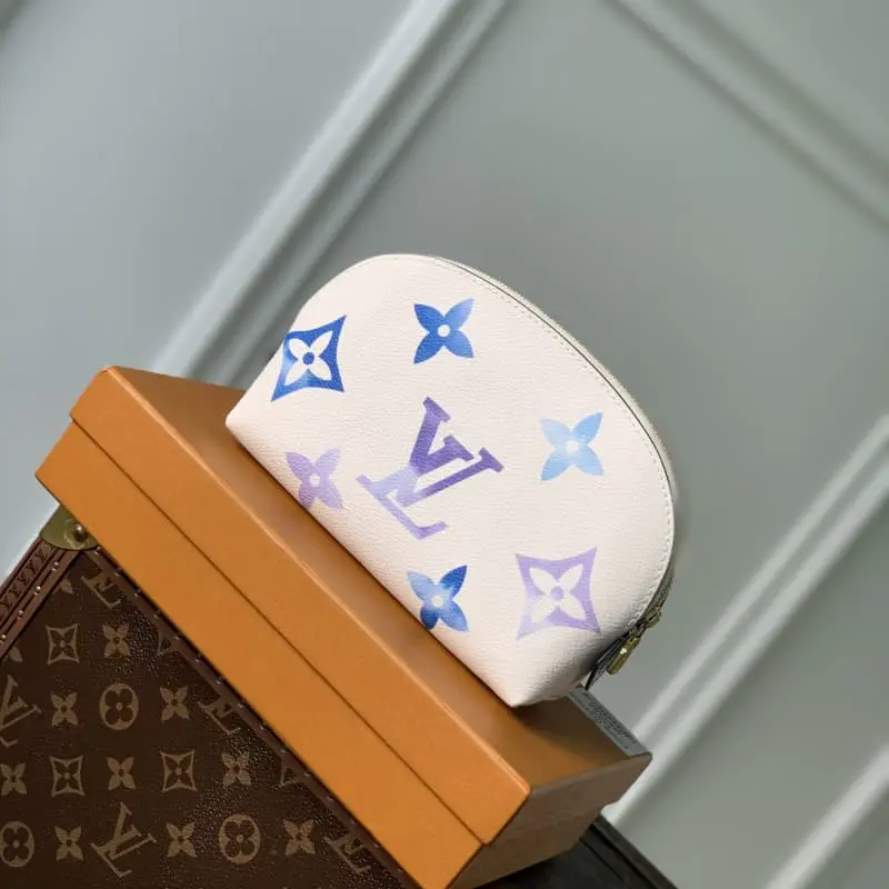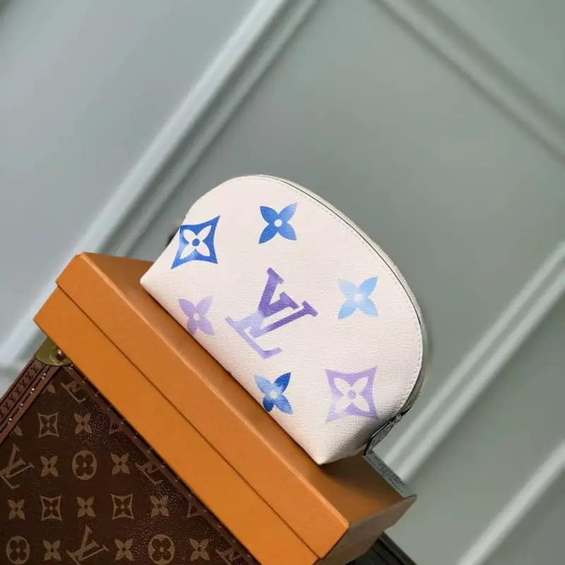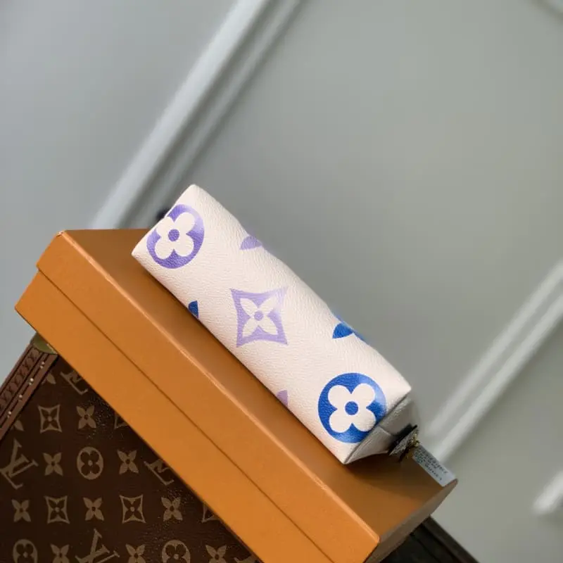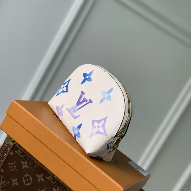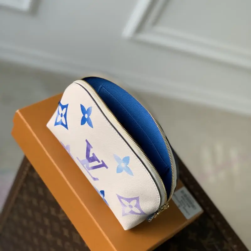 M82388 Summer Blue. This new special edition cosmetics bag is made of coated canvas with an oversized Monogram pattern and opens to a matching leather lining with a Monogram flower pattern. Can be easily put into handbag. The round bag body and flat bottom design make it easy to take out and put in cosmetics. Size: 17x12x6cm