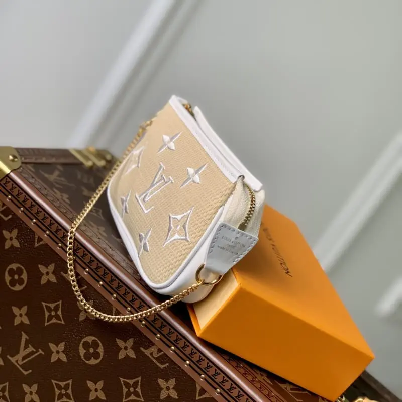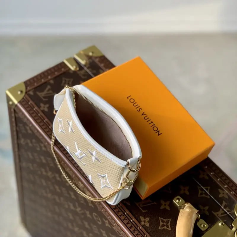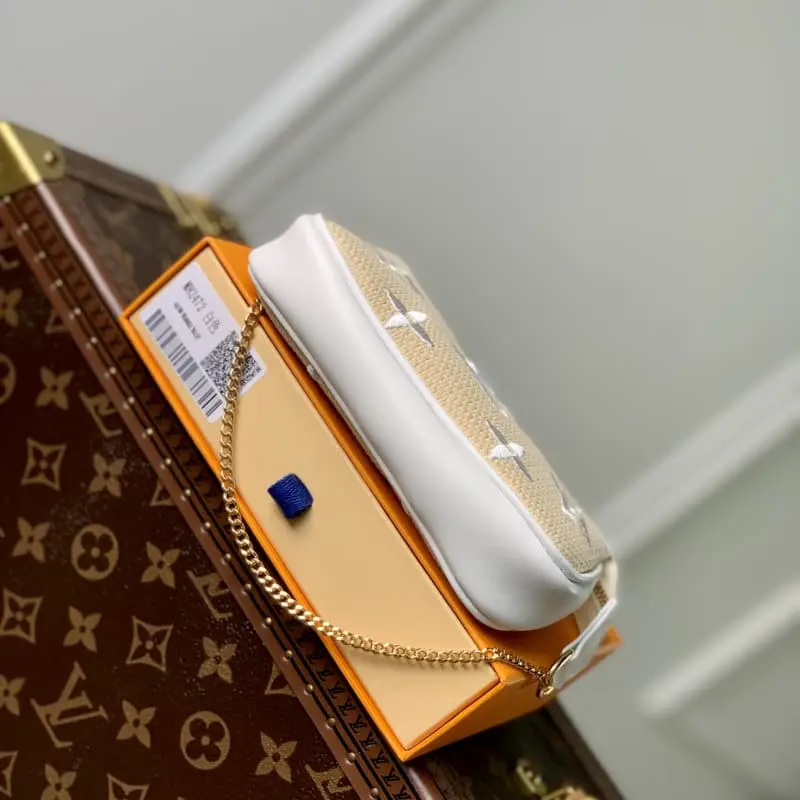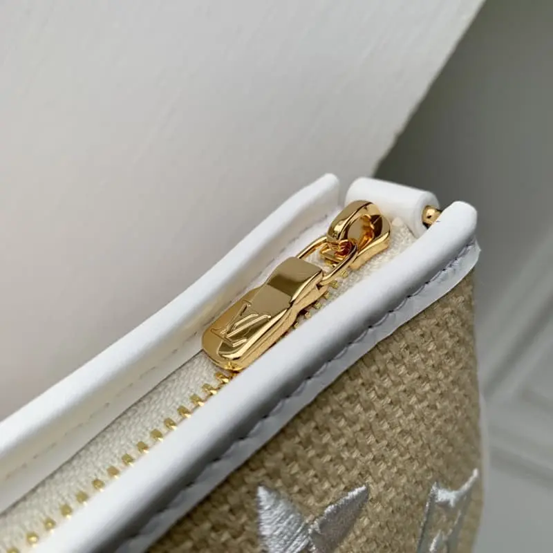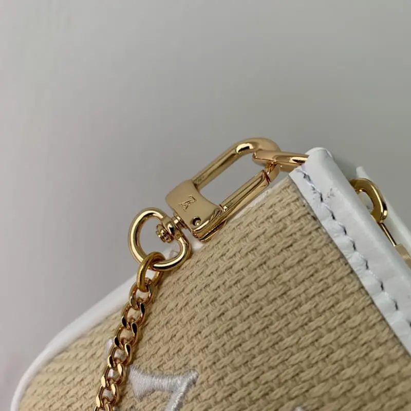 M82472 White uses natural cotton with a black Monogram pattern and is trimmed with leather in the same color. This “Mini Pochette Accessor” has a sophisticated atmosphere. The zipper-style opening makes it a mini-sized cosmetic bag suitable for carrying small items. Attached to the bag or belt with a gold buckle and chain. Size: 15.5??10.5??4