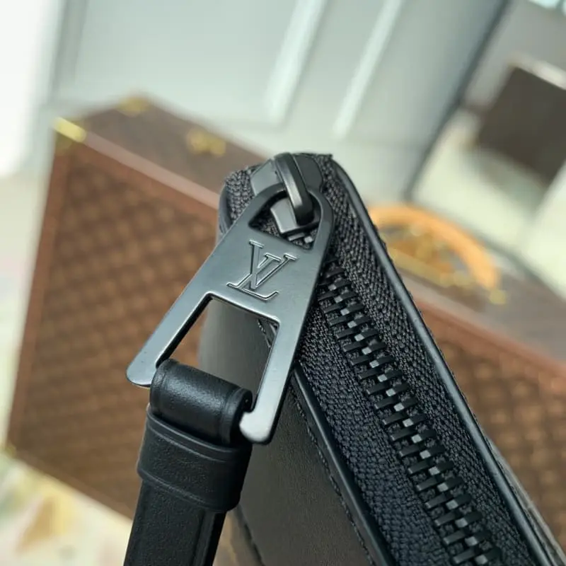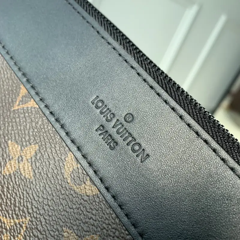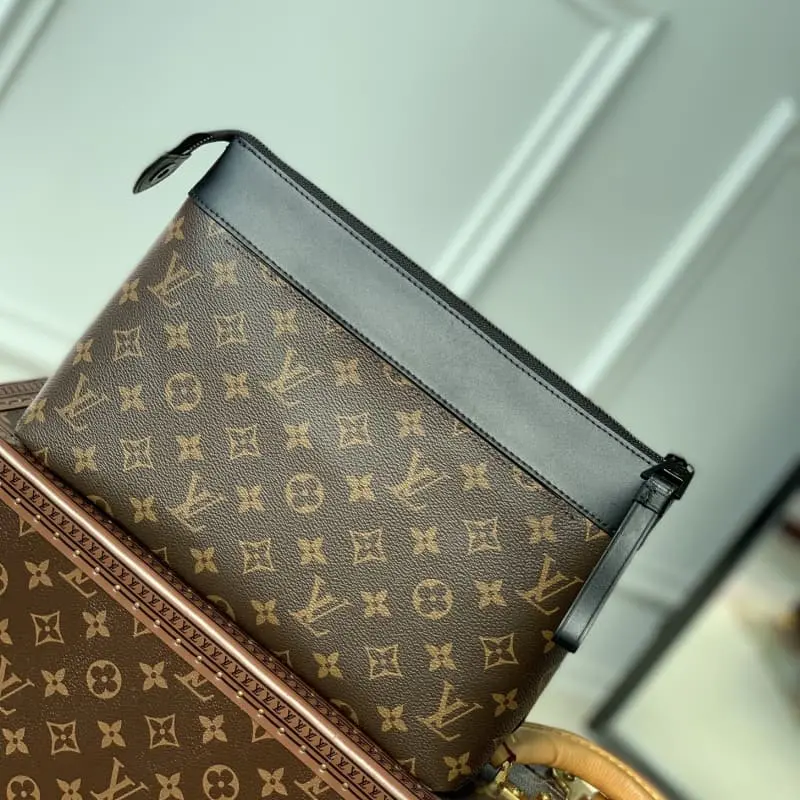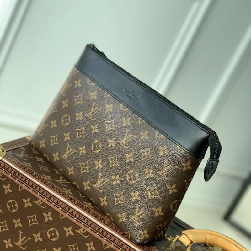 M82543 Pochette Voyage Souple Clutch with Monogram Shadow The Pochette Voyage Souple Clutch is made of monogram shadow cowhide leather with a subtle monogram pattern. Its soft texture and rounded shape complement each other and are matched with back pockets and wrist straps. 32 x 21 x 8 cm (length x height x width)