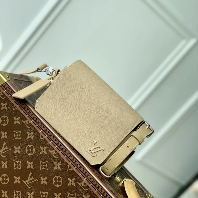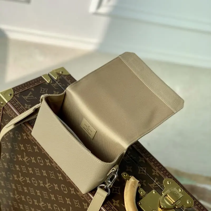 M82804 Khaki Full Leather Men’s Messenger Bag Series Autumn and Winter New FASTLINE WEARABLE WALLET Handbag This Fastline Wearable Wallet handbag reveals the iconic style of the LV Aerogram series through the metal LV letters and the chamfered corner design of the flap. The magnetic flap opens with ample space and the zippered inner pocket ensures neat storage. The adjustable shoulder strap allows for comfortable carrying. 17.3 x 12 x 7 cm.