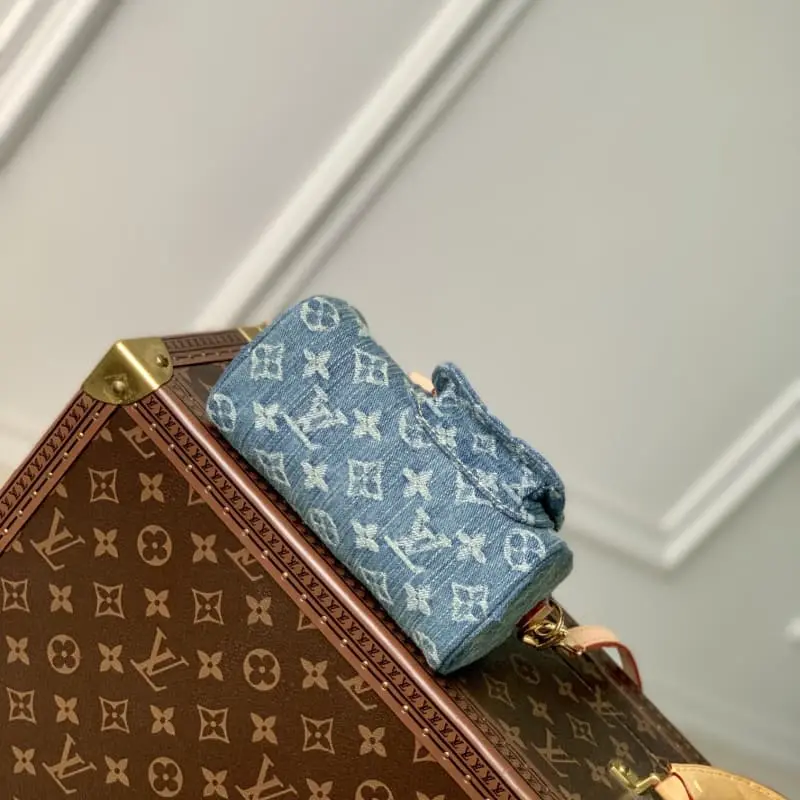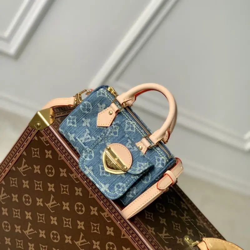M82950 The adorable Speedy Nano handbag is cuter in stonewashed monogram denim with natural leather handles and a removable shoulder strap. The denim canvas is made from certified organic cotton. On the side of the bag is a small pocket that can be opened and closed with a unique pleated lock. The Nano fits an iPhone, a compact wallet and a lipstick. 16 x 10 x 7.5 cm (L x H x W)