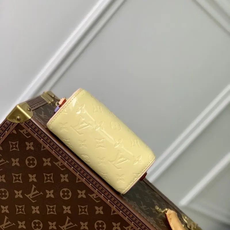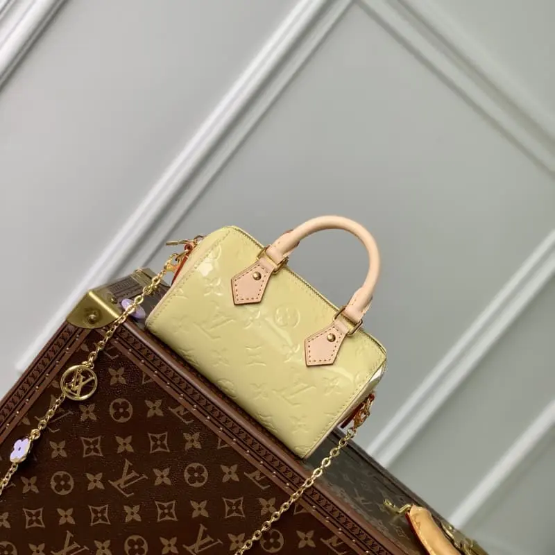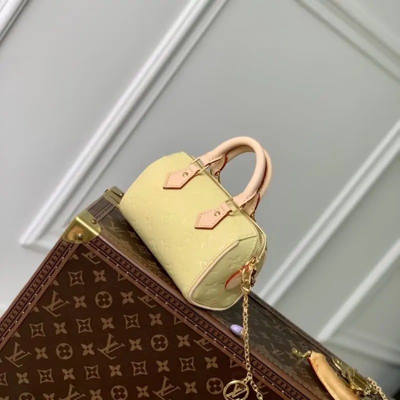 M83000 Blue The Nano Speedy in Monogram Vernis pastel-hued patent leather is a mini version of the brand’s most famous travel bag. The bright patent leather is embossed with the Monogram pattern and is paired with a natural leather top handle and a detachable gold chain with a charm. It is the perfect size for a mobile phone and a small wallet. 16 x 10 x 7.5 cm (length x height x width)