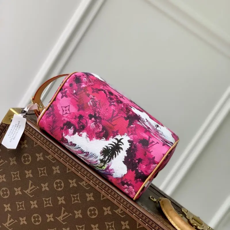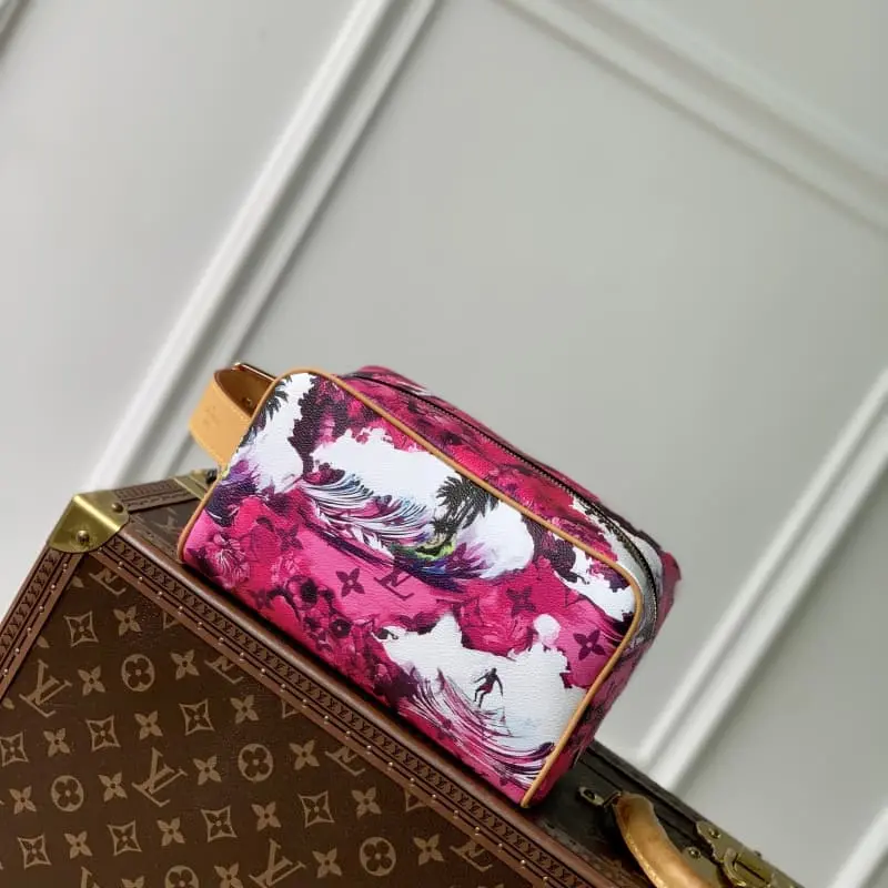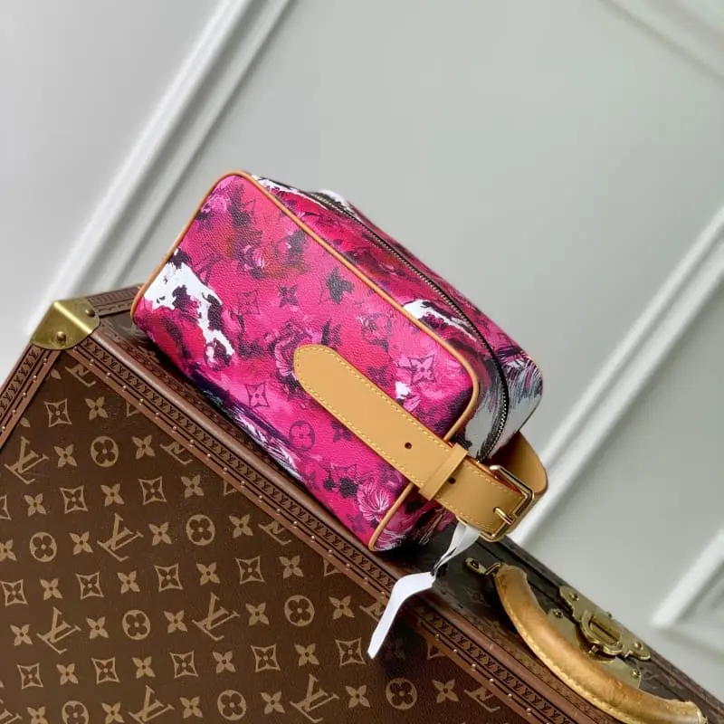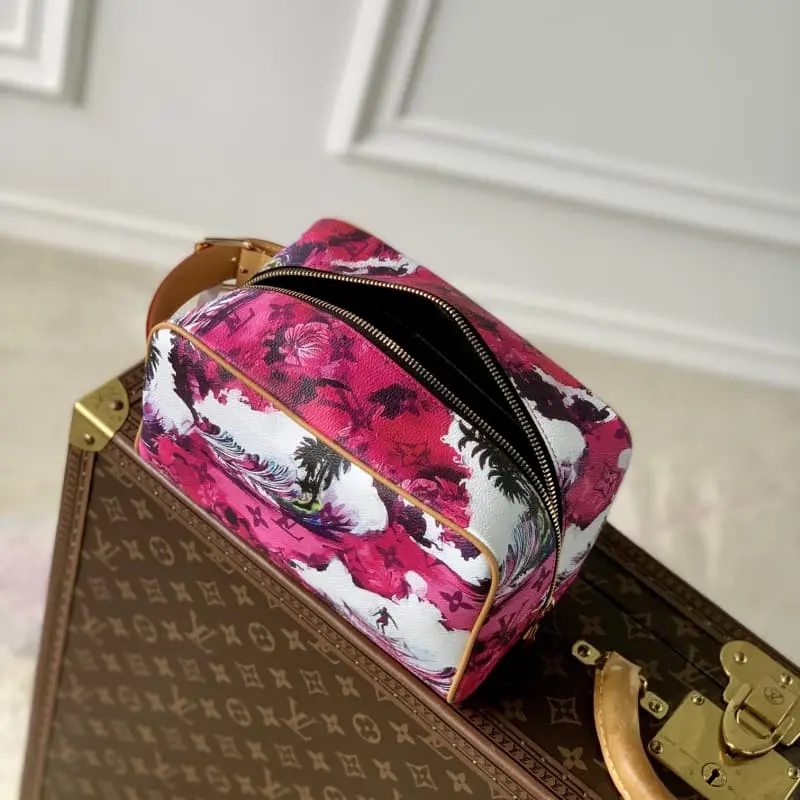 M83112 Rose Red Toiletry Bag This vanity bag is made of Damier Graphite canvas with a rugged feel. The practical elastic lining keeps the bottles upright. Damier Graphite canvas, cotton lining, leather trim, silver metal hardware, wide zipper closure, and a zippered inner pocket.