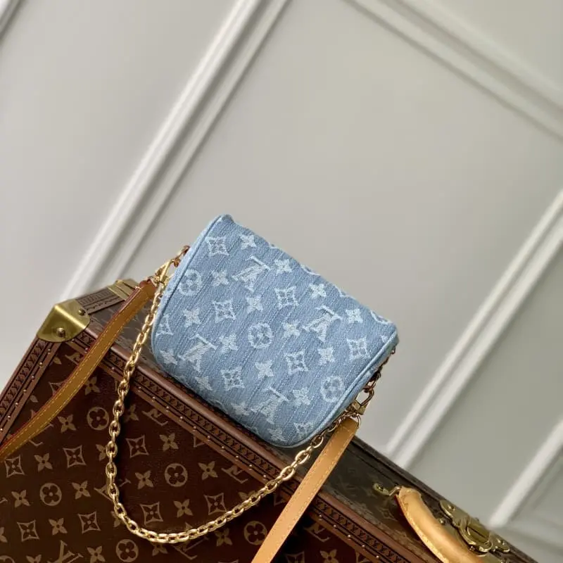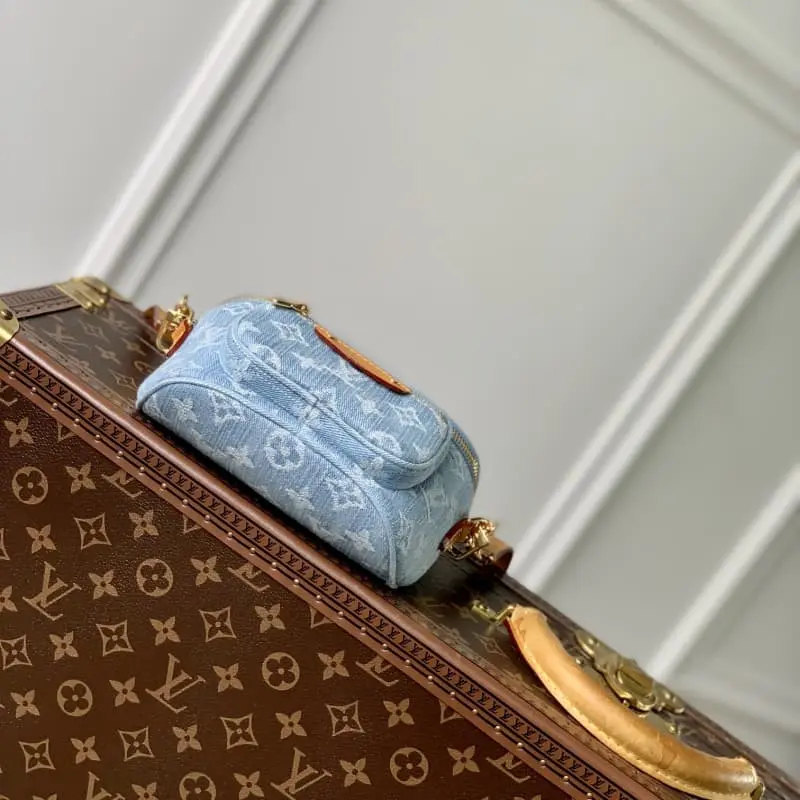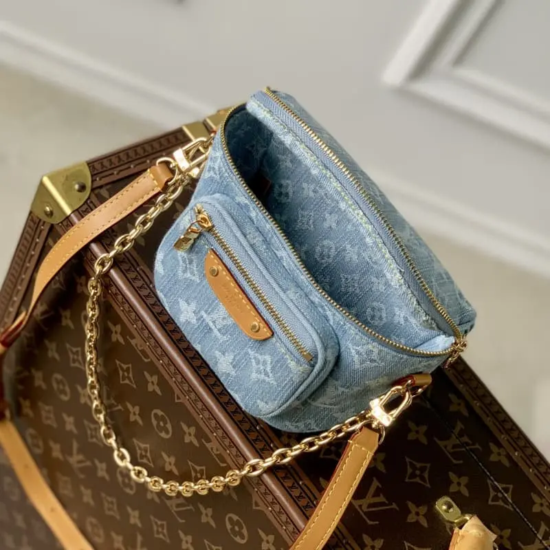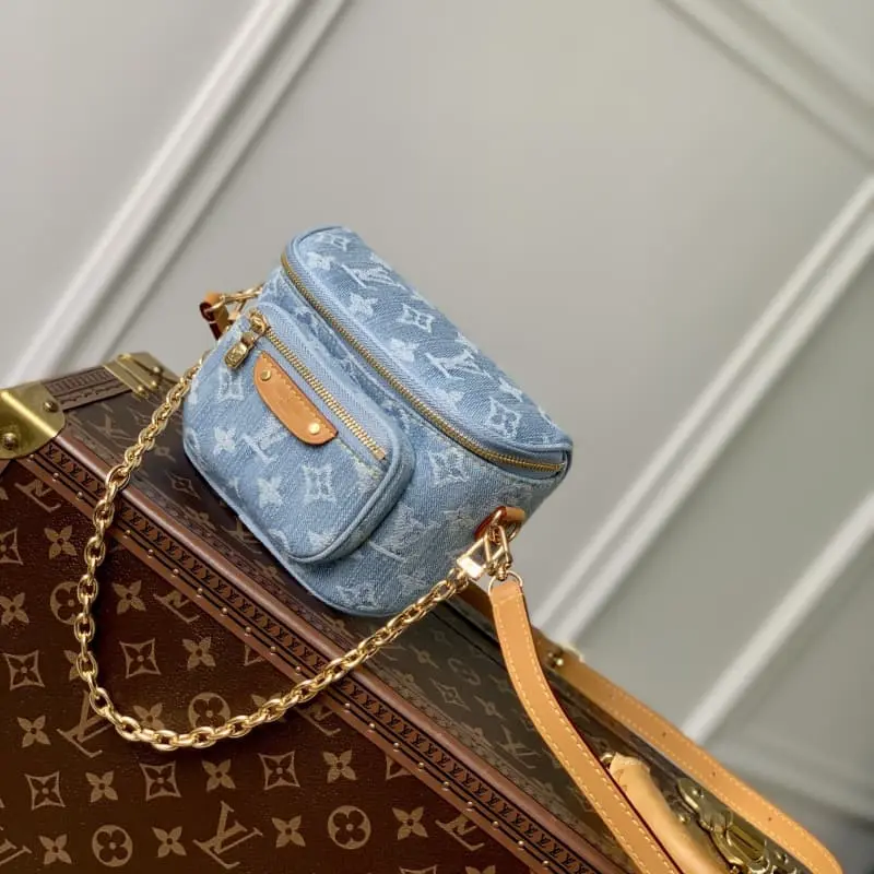 M83353 This Mini Bumbag is made of denim with a bleached and sand-washed Monogram pattern for a vintage look. The trendy design features a main zip compartment and a front zip pocket, the latter of which is embellished with a Lbag embossed leather label. Both the chain and the adjustable shoulder strap are removable for a variety of carry options. The gift box packaging for this product may vary depending on stock availability and may differ from the packaging style displayed on this product page. Please refer to the actual gift box packaging style received for details. 17 x 12 x 9.5 cm (length x height x width)