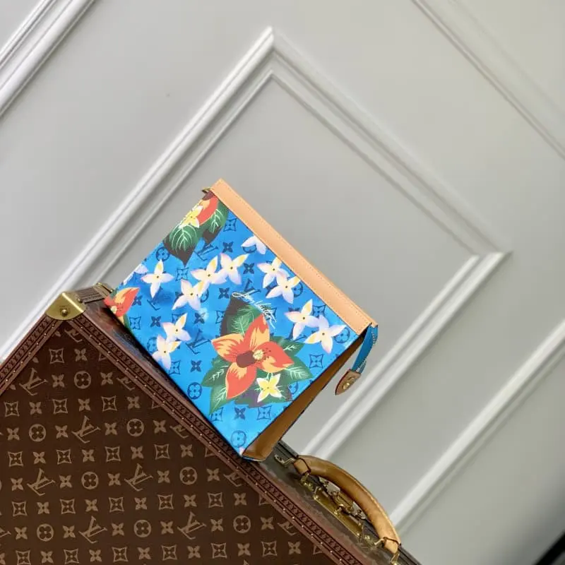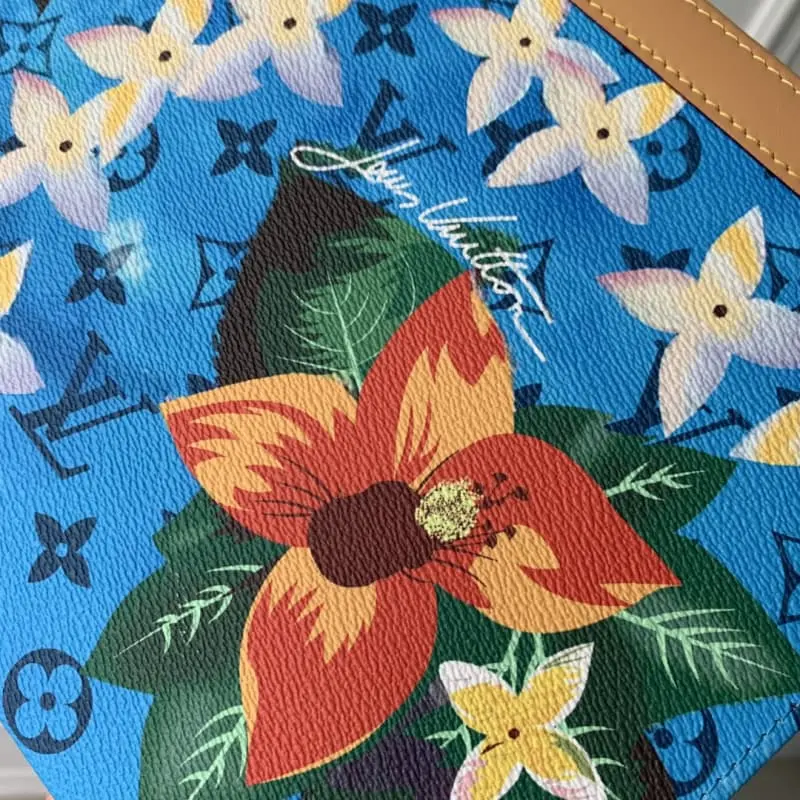 M83465 Blue Virgil Abloh renews the Pochette Voyage handbag design with a skateboard coconut tree theme, and makes the ethereal LV logo appear on the Monogram canvas background. Pockets and card slots for orderly storage. Size: 27.0 x 21.0 x 3.0 cm