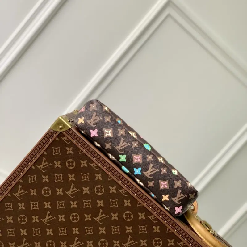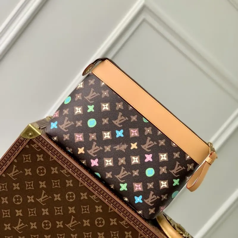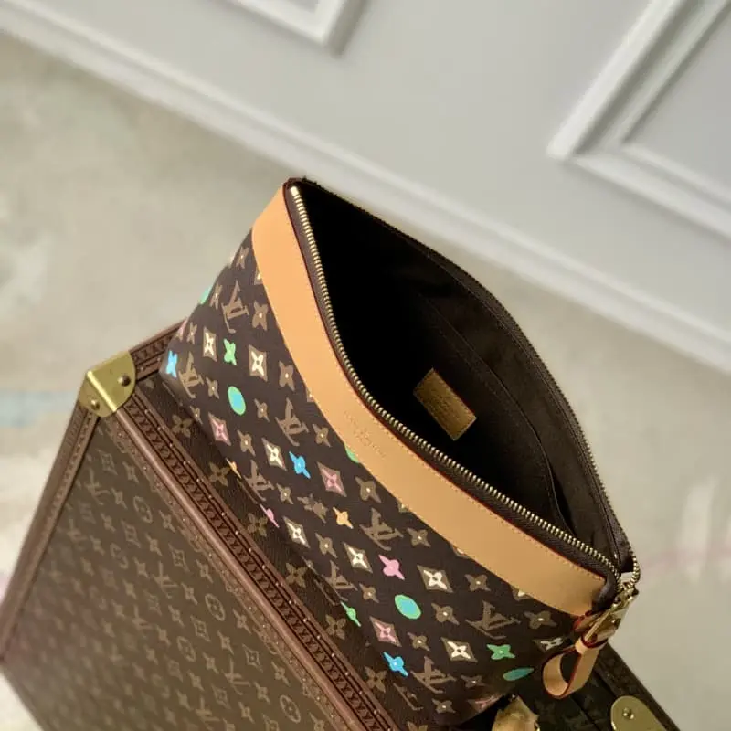 M83568 Brown Flower POCHETTE VOYAGE SOUPLE Clutch The Pochette Voyage Souple Clutch is made of soft Monogram Eclipse coated canvas. The classic Pochette Voyage Clutch is outlined with rounded strokes to bring a comfortable travel experience. The slim configuration features a zipper compartment and a magnetic back pocket. Dimensions: 32 x 21 x 8 cm (length x height x width)