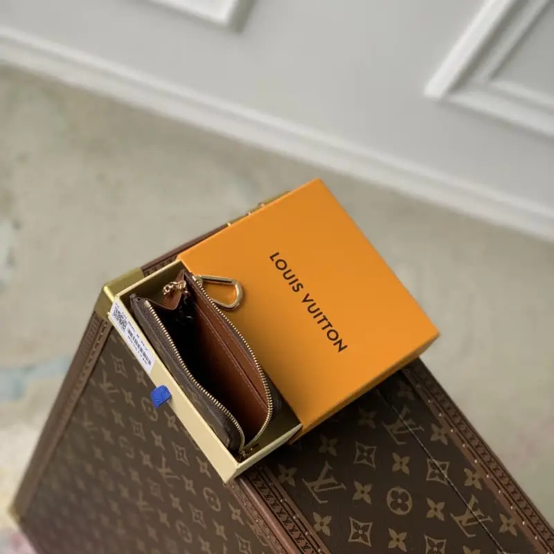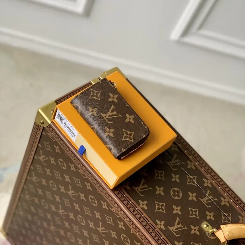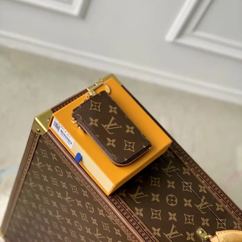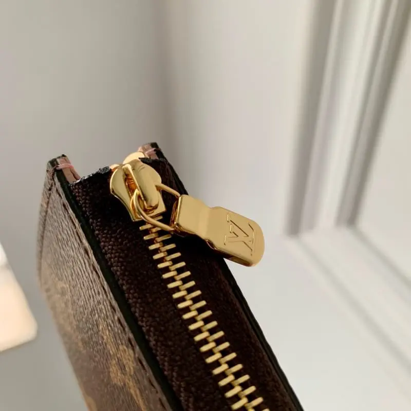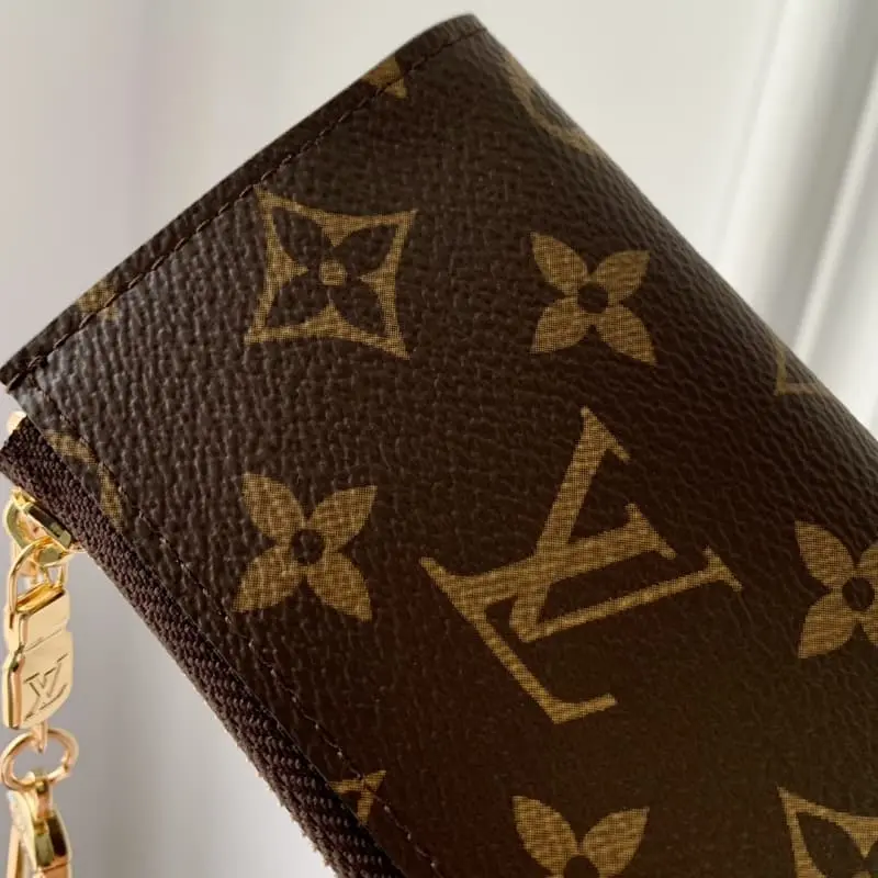 M83612 Monogram/Brown [Noa Key Holder] Made from iconic Monogram canvas, the Noa key holder is an elegant and practical accessory. Its L-shaped zipper opens to reveal a soft-colored leather lining and a gold hook and chain. The inner flat pocket is ideal for tickets or receipts. Dimensions: 11x7x1.5