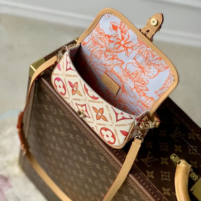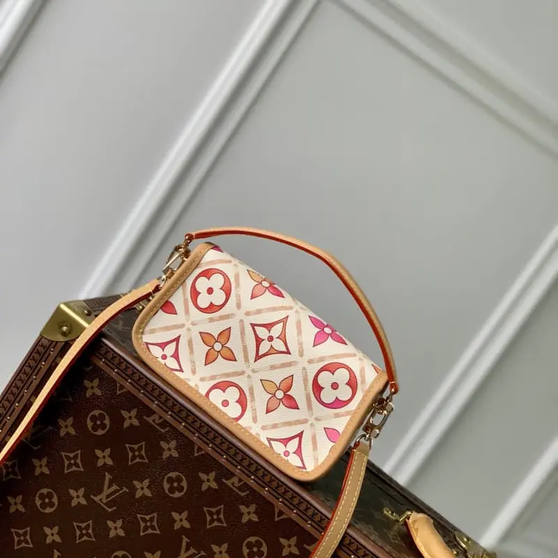 M83621 This Nano Diane handbag is from the LV By the Pool summer collection, which condenses the Diane handbag into a pocket version. The coated canvas presents colorful Monogram Tiles patterns, exuding a romantic Mediterranean style. The buckle strap opens the rounded flap with leather trim, adding an elegant touch. The gift box packaging of this product may be reasonably adjusted according to stock conditions and may be different from the packaging style displayed on this product page. Please refer to the actual gift box packaging style received. 19 x 10.5 x 6 cm (length x height x width)