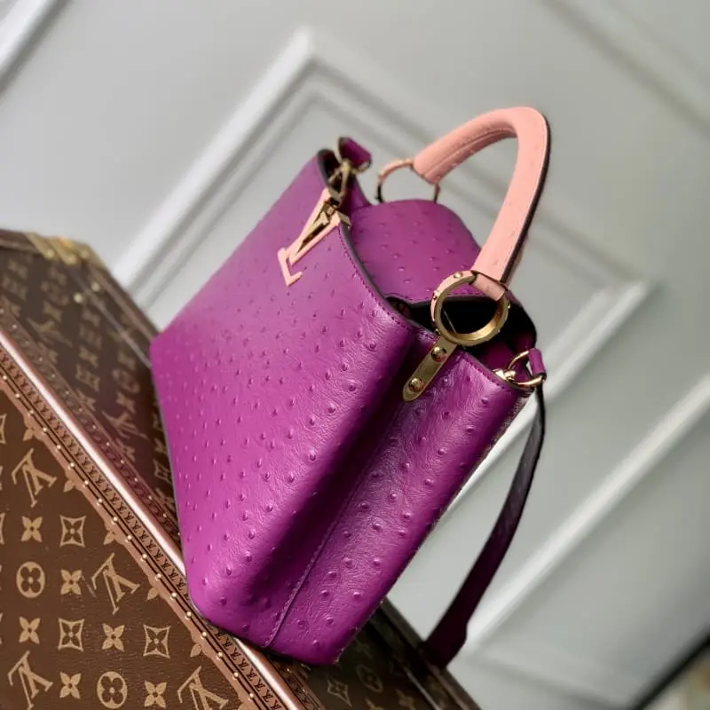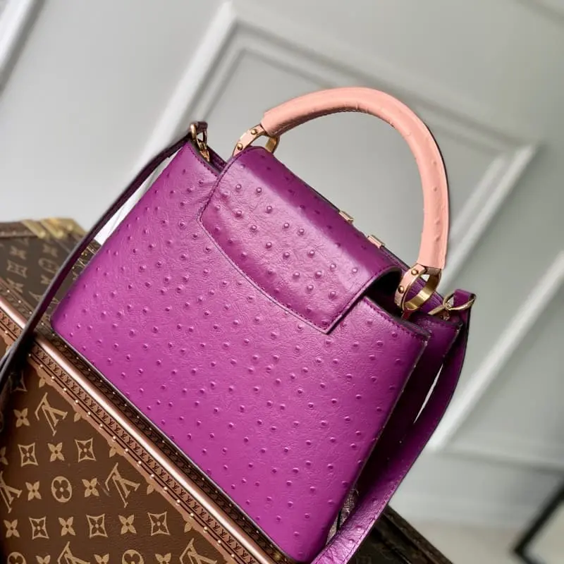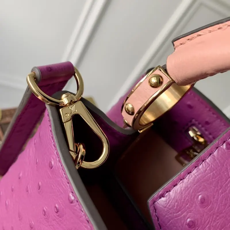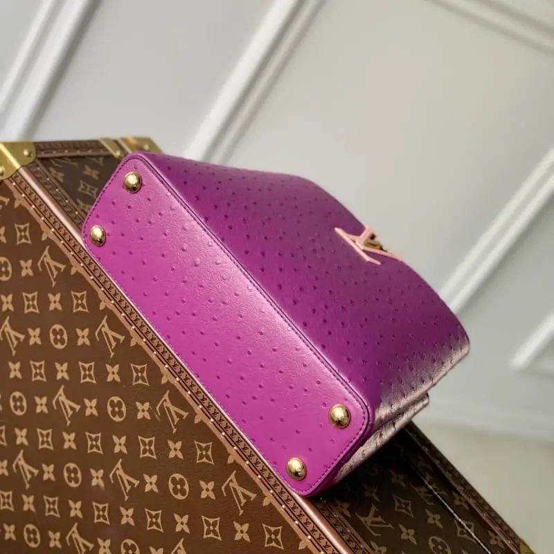 Exclusive real shot M93483 Ostrich pattern purple small size] Capucines small size handbag French imported calfskin, shiny metal accessories, unique Capucines flap can be put inside the bag to display the letter logo, and can be turned out to show the Monogram Flower pattern size: 27??18??9 cm