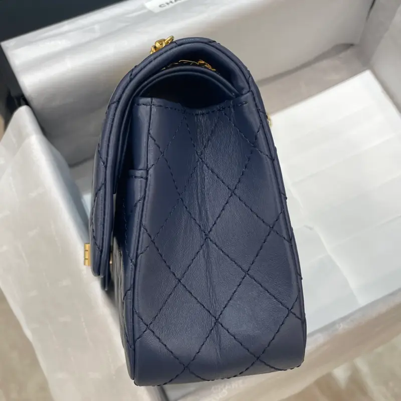 2.55 Dark Blue Gold Chain This dark blue, distressed gold chain is a bit more lively than black, yet still retains the classic appeal. The chain is just the right length, and it looks great in all three ways. It’s versatile and can be worn with both casual and formal attire. It’s roomy enough for a power bank, tissues, a small wallet, a card holder, powder, lipstick, keys, and a candy box. Dimensions: 16x24x7.5cm