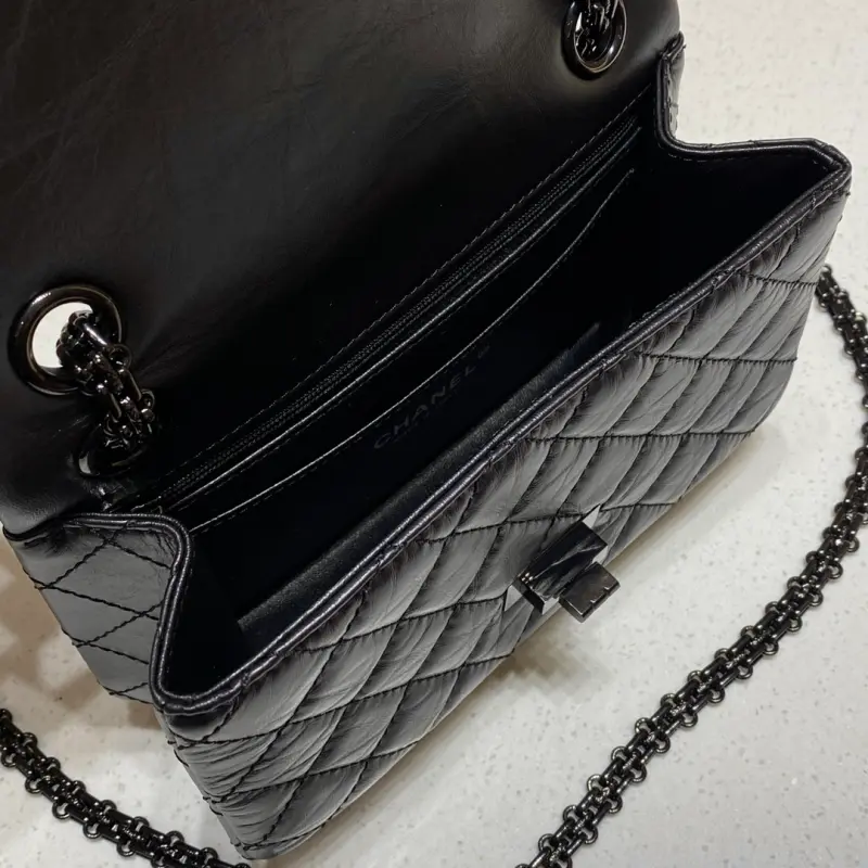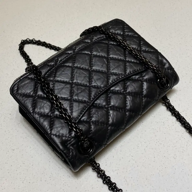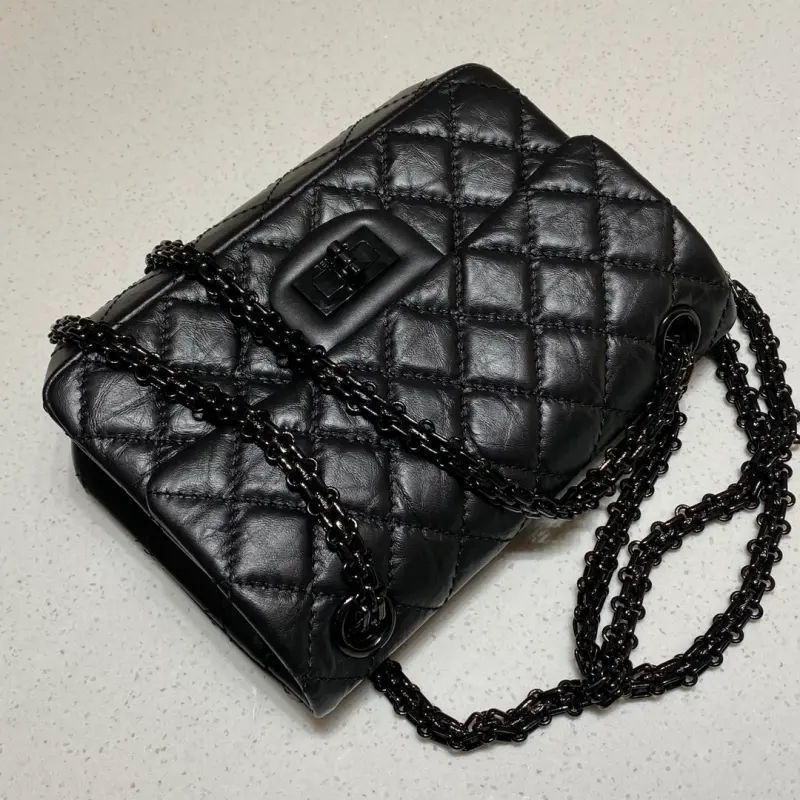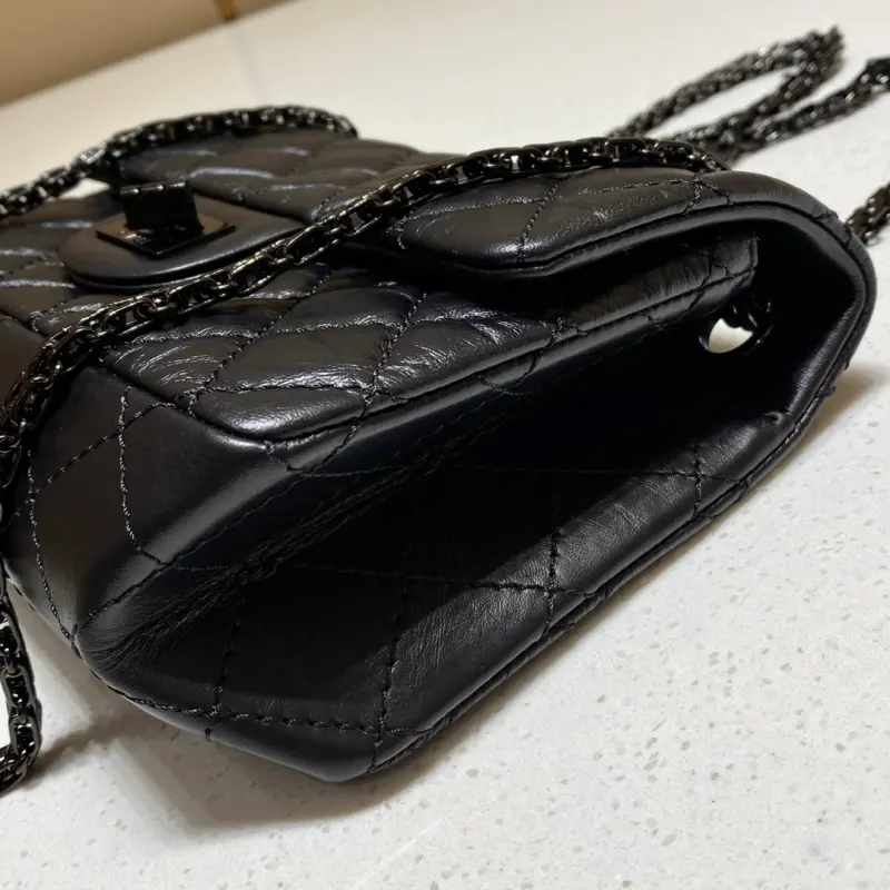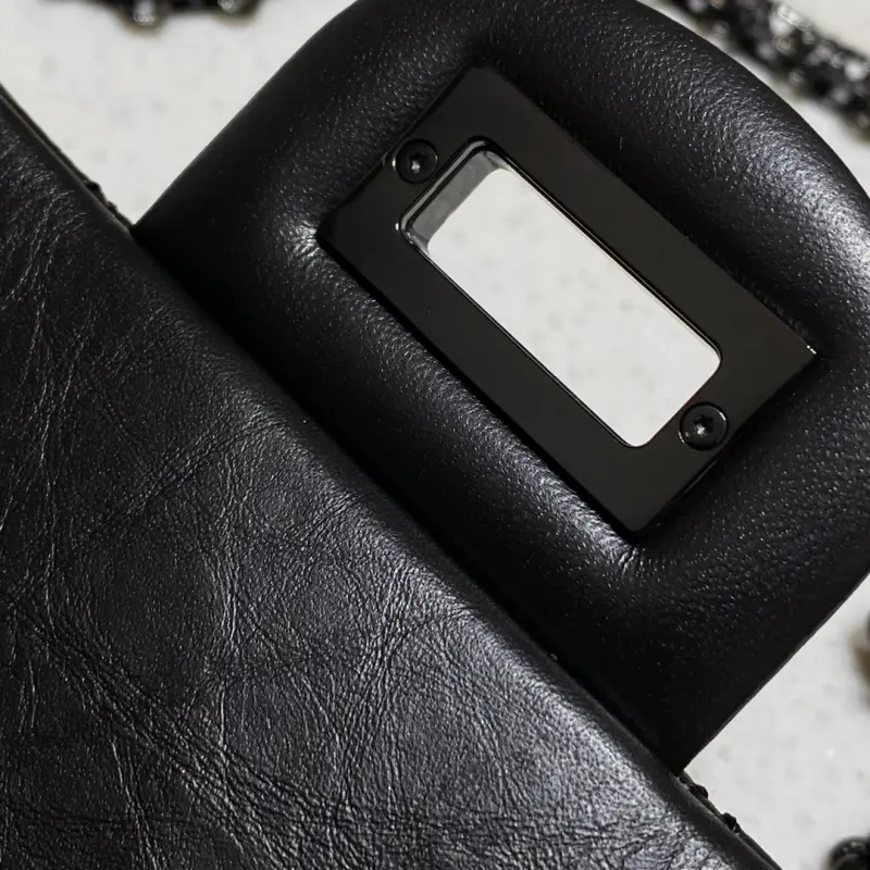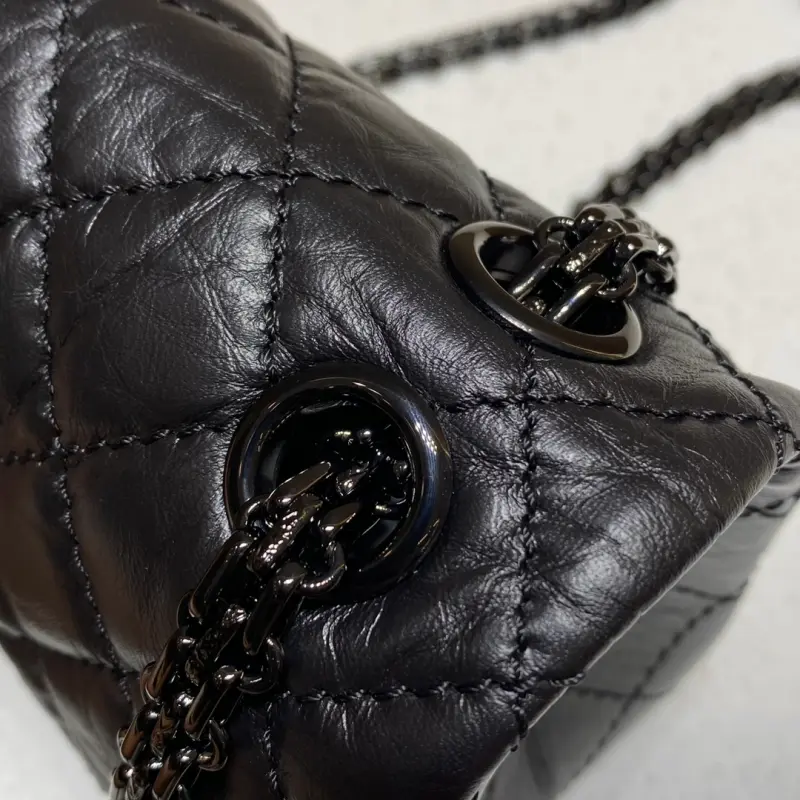2.55 so black mini retro wrinkled leather with a black chain is so cool! Very different feeling, low-key, and the style of the times, a must-have for cool girls~ Size: 15.5x20x6cm