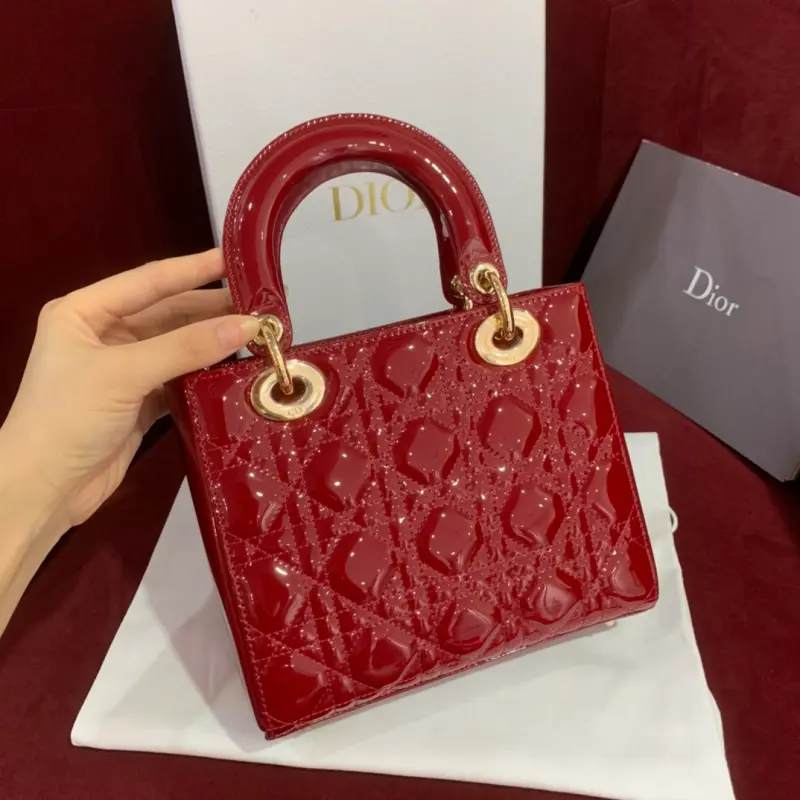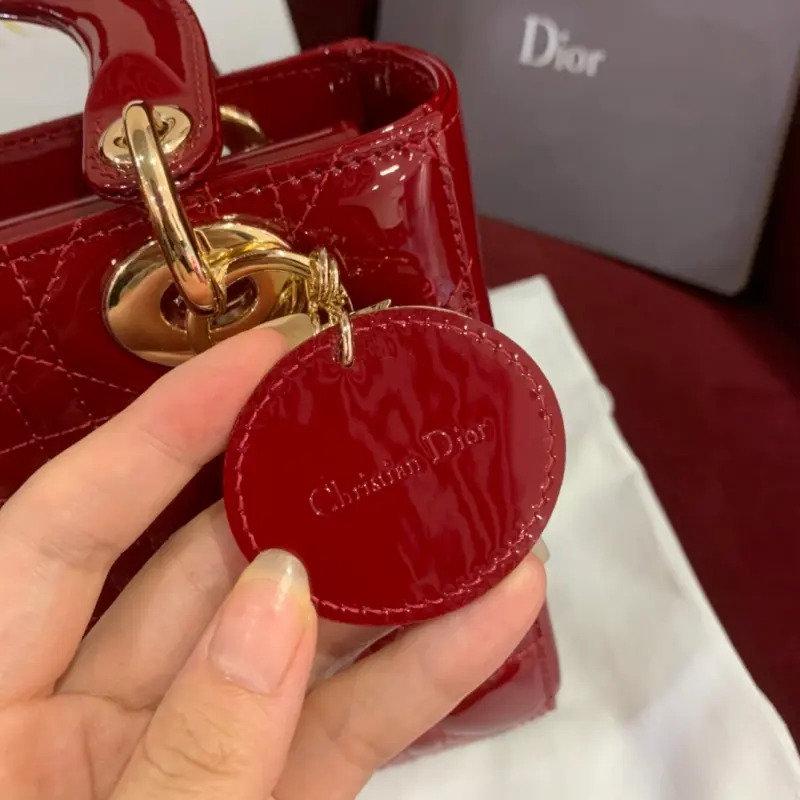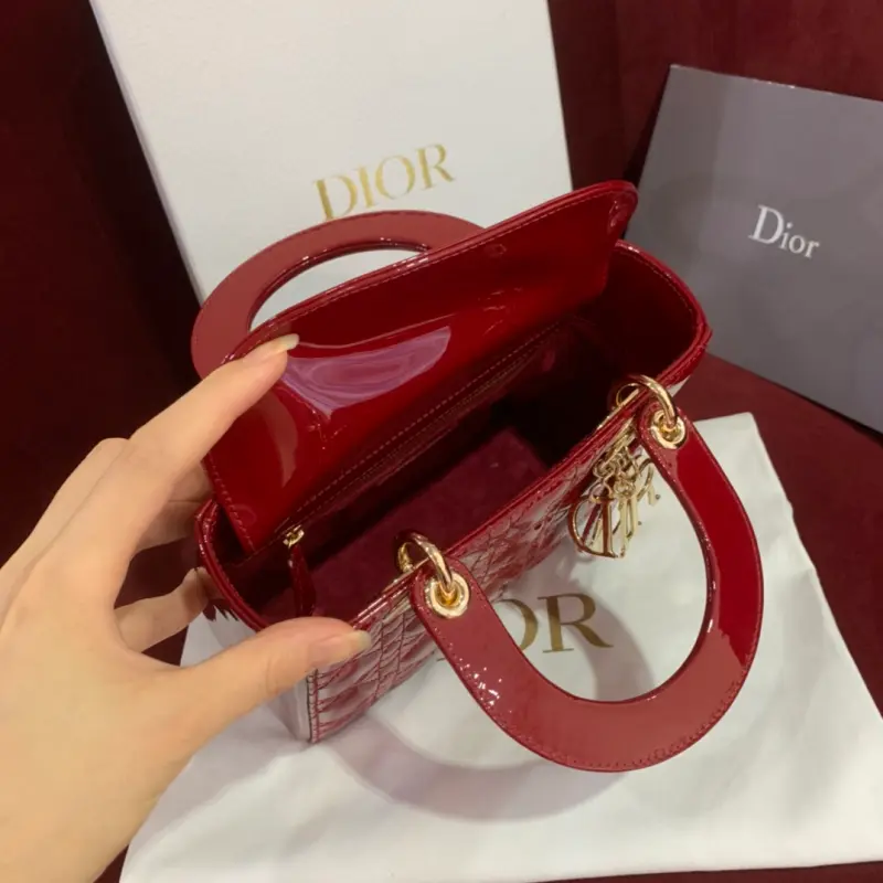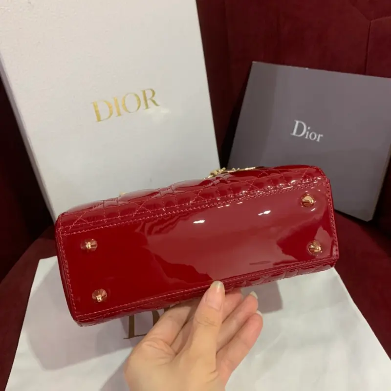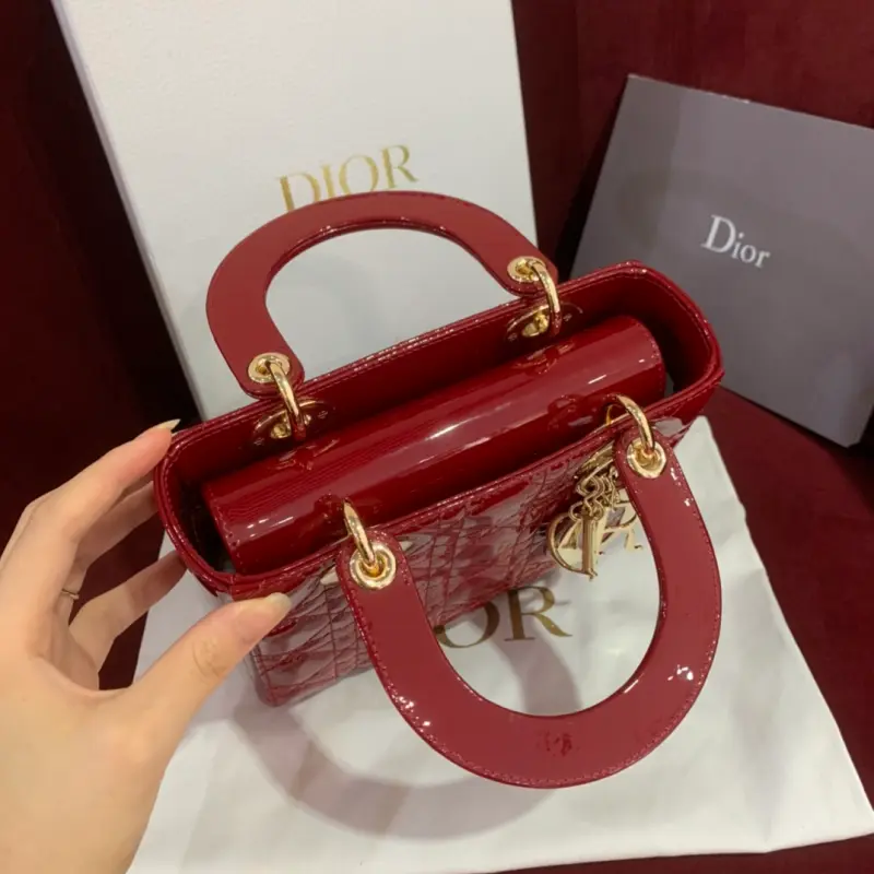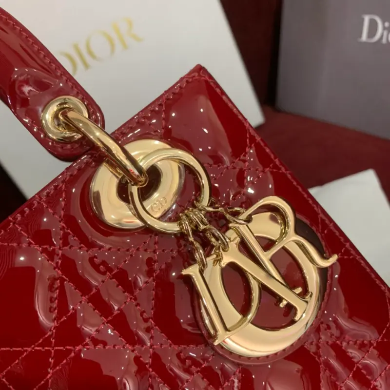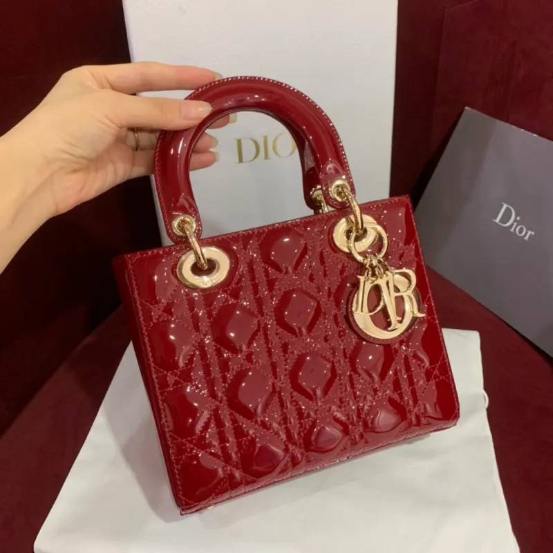 Upgraded burgundy Lady mini handbag in patent leather with cannage pattern. Paired with a chain and light gold metal accessories. Long chain with cannage stitching. Detachable long chain with light gold hardware. Can be carried by hand, on the shoulder or across the body. Size: 20cm