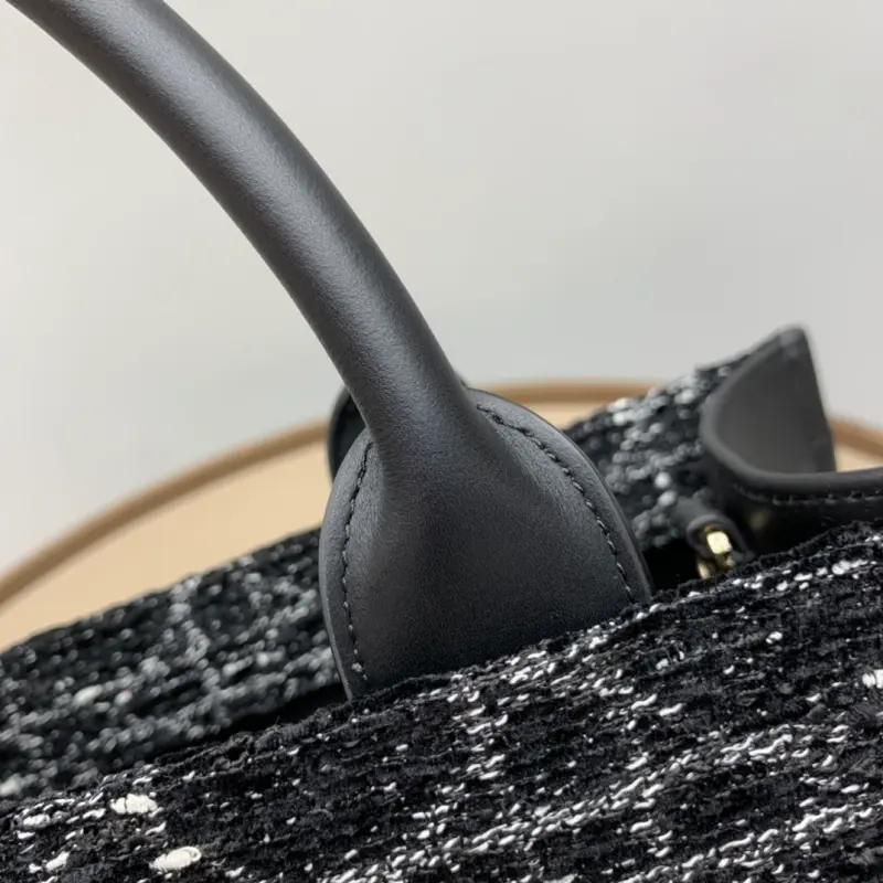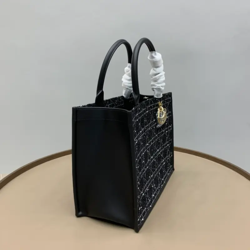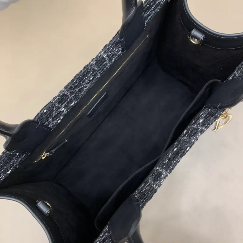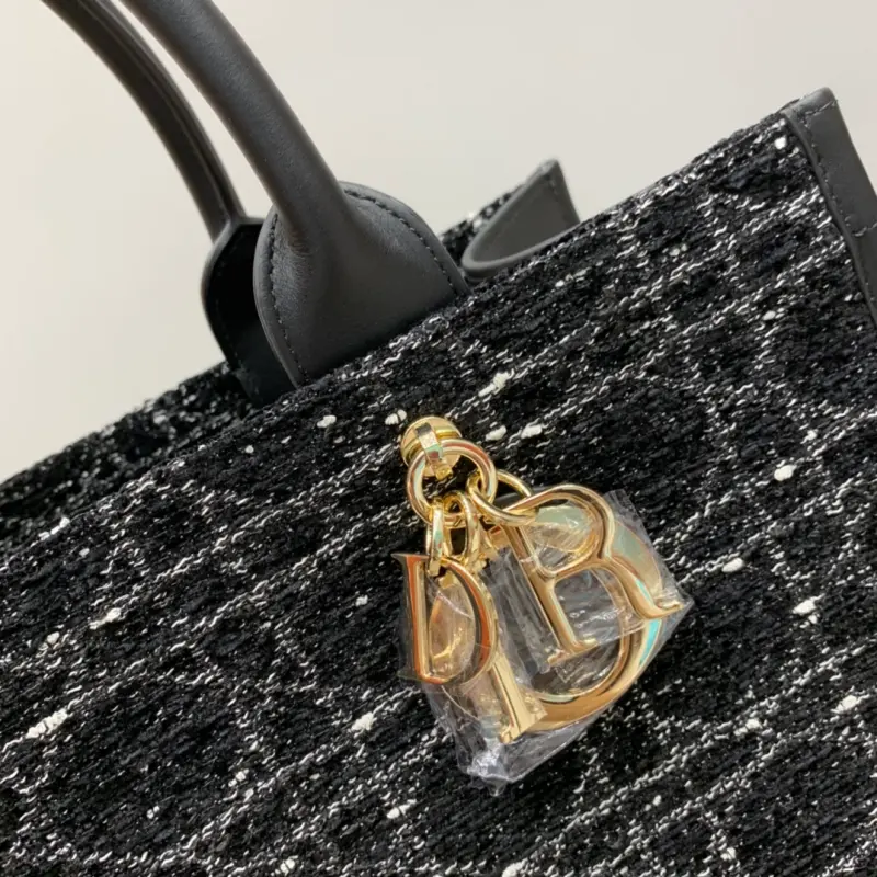 Medium Book Tote Handbag “Black Cannage Tweed” The Book Tote handbag presented by Maria Grazia Chiuri embodies Dbag’s classic interpretation of elegance. It is decorated with textured black tweed embroidery all over, highlighting the mixed thread cannage pattern, and one handle is decorated with a light gold-finished metal Dbag charm. The interior is made of ultra-soft leather and has a zipper pocket and a slip pocket to properly store various daily necessities. The lightweight and practical medium style is paired with an adjustable and detachable shoulder strap, highlighting Dbag’s exquisite craftsmanship and can be carried by hand or on the shoulder. Dimensions: 36.5 x 28 x 17.5cm