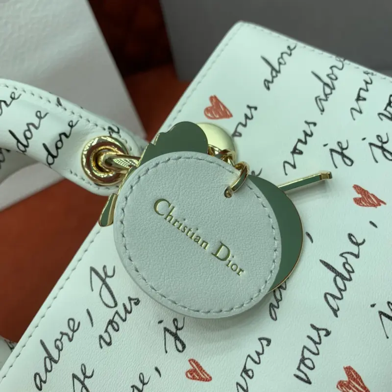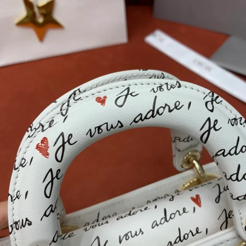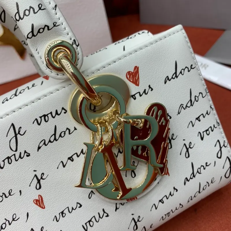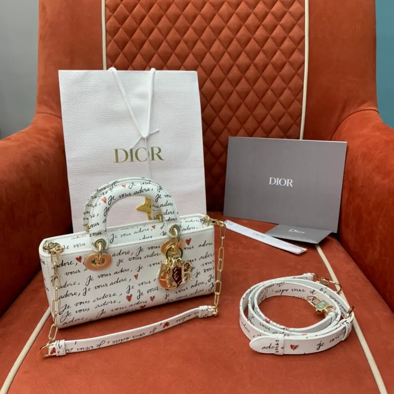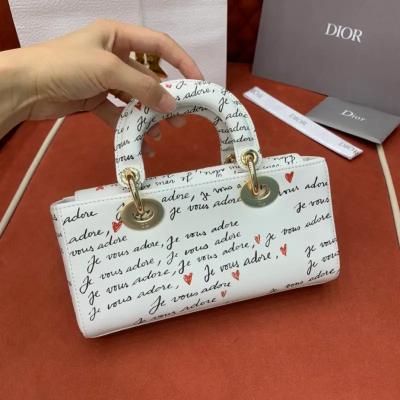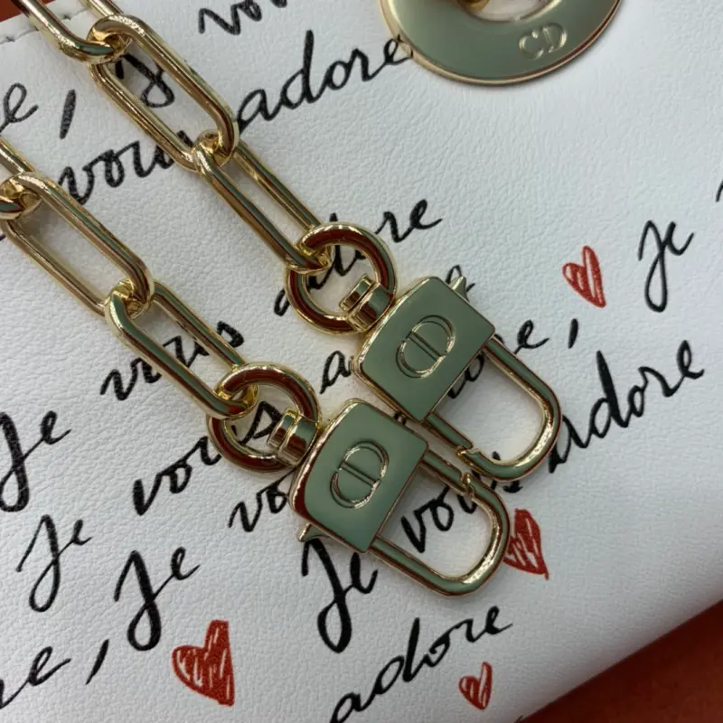 The D-Joy Dbagamour limited edition collection highlights the classic minimalist aesthetic of the Lady Dbag collection and embodies Dbag’s profound insight into elegance and beauty. Crafted from white cowhide leather, it is embellished with a black and red Je Vous Adore (I Love You) pattern, inspired by Marc Bohan’s Dbag design archive. The light gold-finished metal Dbag charm is embellished with a red enamel heart charm for a more refined look. The small size, with a detachable chain shoulder strap and an adjustable and detachable leather shoulder strap, can be carried by hand, on the shoulder or across the body, making it an ideal choice for everyday looks. It can also be easily paired with other Dbagamour items to create a matching look. Detachable chain shoulder strap Detachable and adjustable leather shoulder strap Internal slip pocket Dust bag included Made in Italy Dimensions: 22??12??6