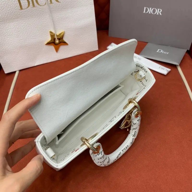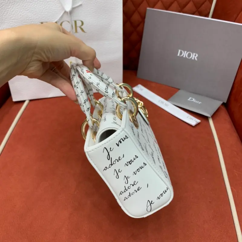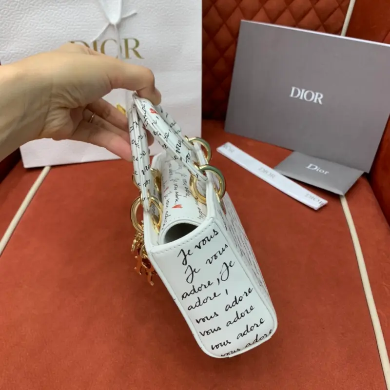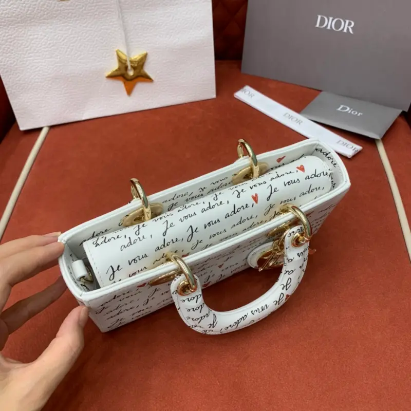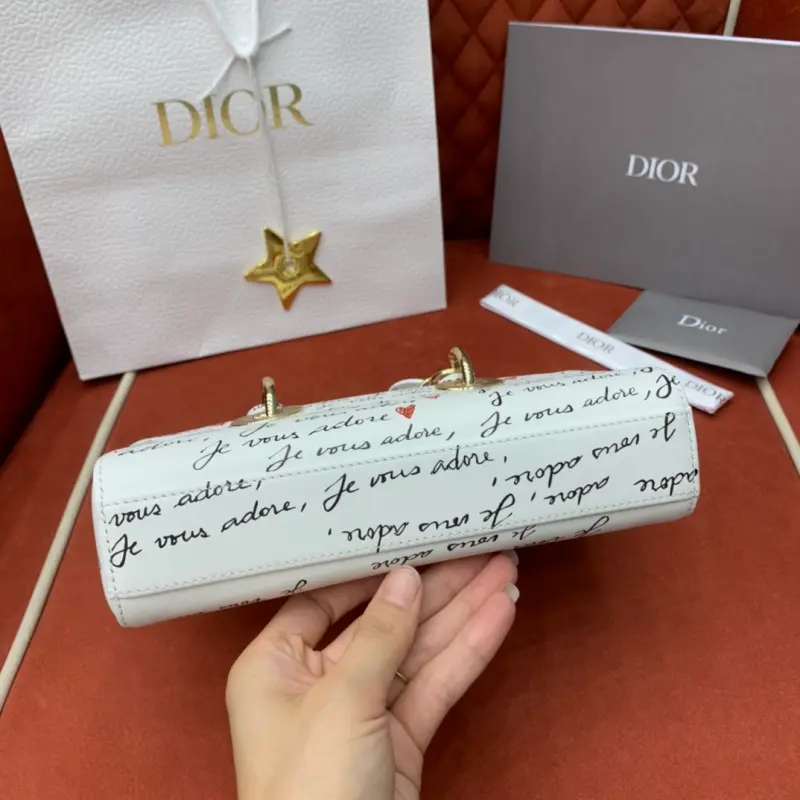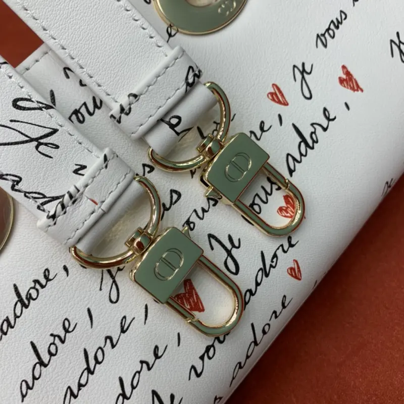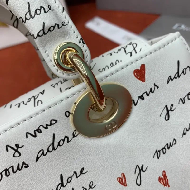 The D-Joy Dbagamour limited edition collection highlights the classic minimalist aesthetic of the Lady Dbag collection and embodies Dbag’s profound insight into elegance and beauty. Crafted from white cowhide leather, it is embellished with a black and red Je Vous Adore (I Love You) pattern, inspired by Marc Bohan’s Dbag design archive. The light gold-finished metal Dbag charm is embellished with a red enamel heart charm for a more refined look. The small size, with a detachable chain shoulder strap and an adjustable and detachable leather shoulder strap, can be carried by hand, on the shoulder or across the body, making it an ideal choice for everyday looks. It can also be easily paired with other Dbagamour items to create a matching look. Detachable chain shoulder strap Detachable and adjustable leather shoulder strap Internal slip pocket Dust bag included Made in Italy Dimensions: 22??12??6