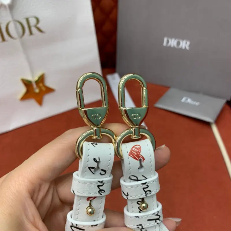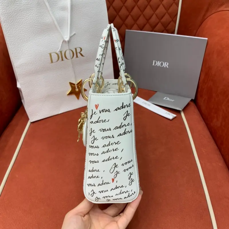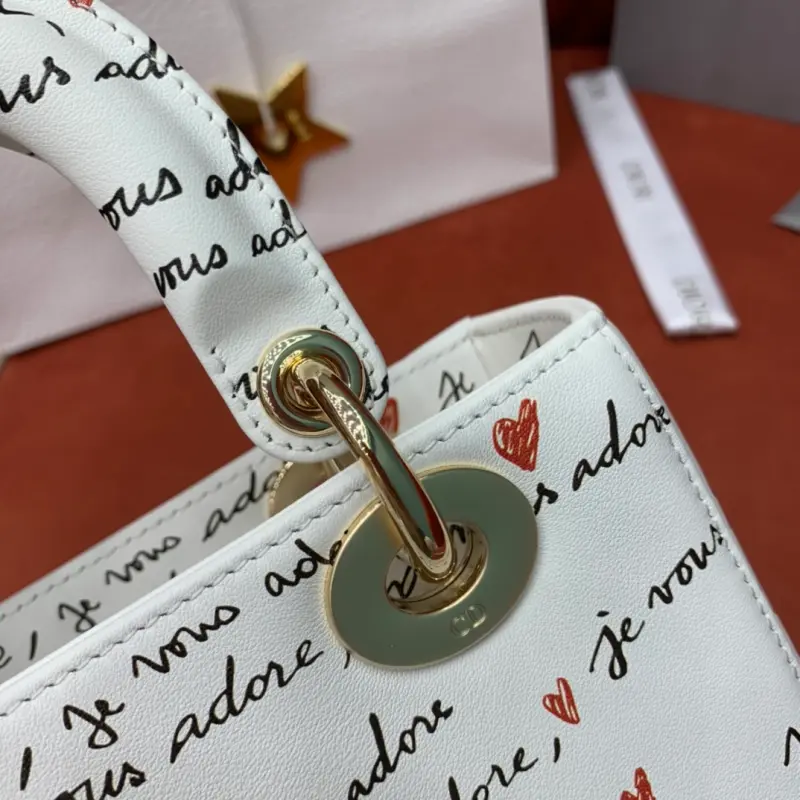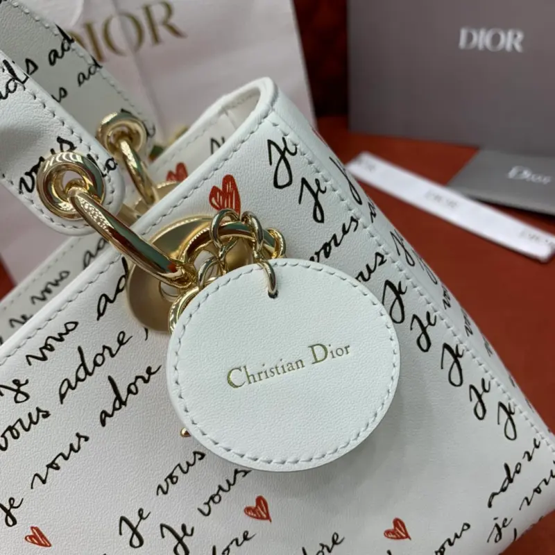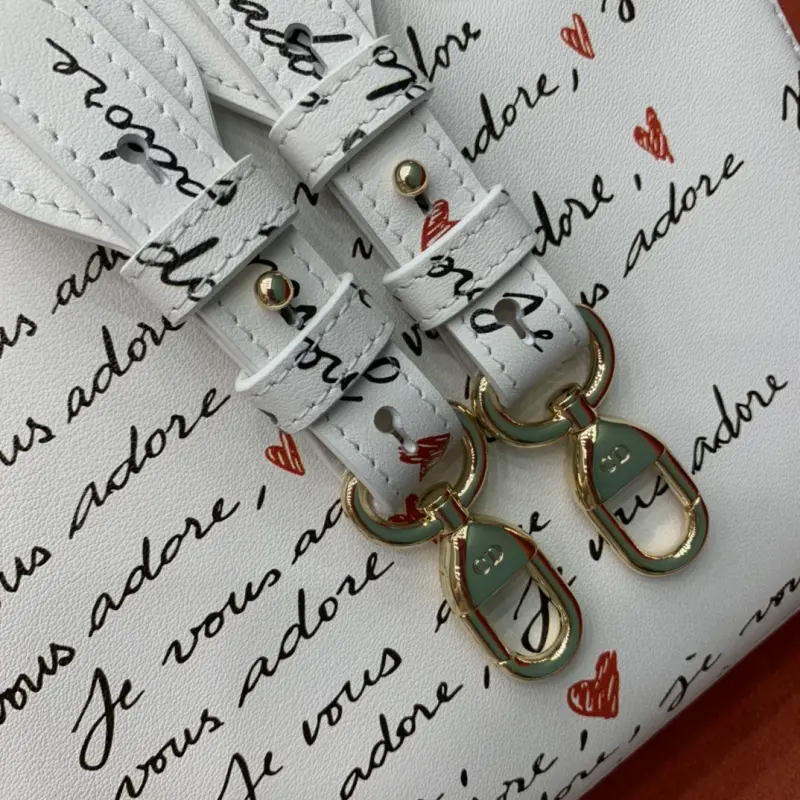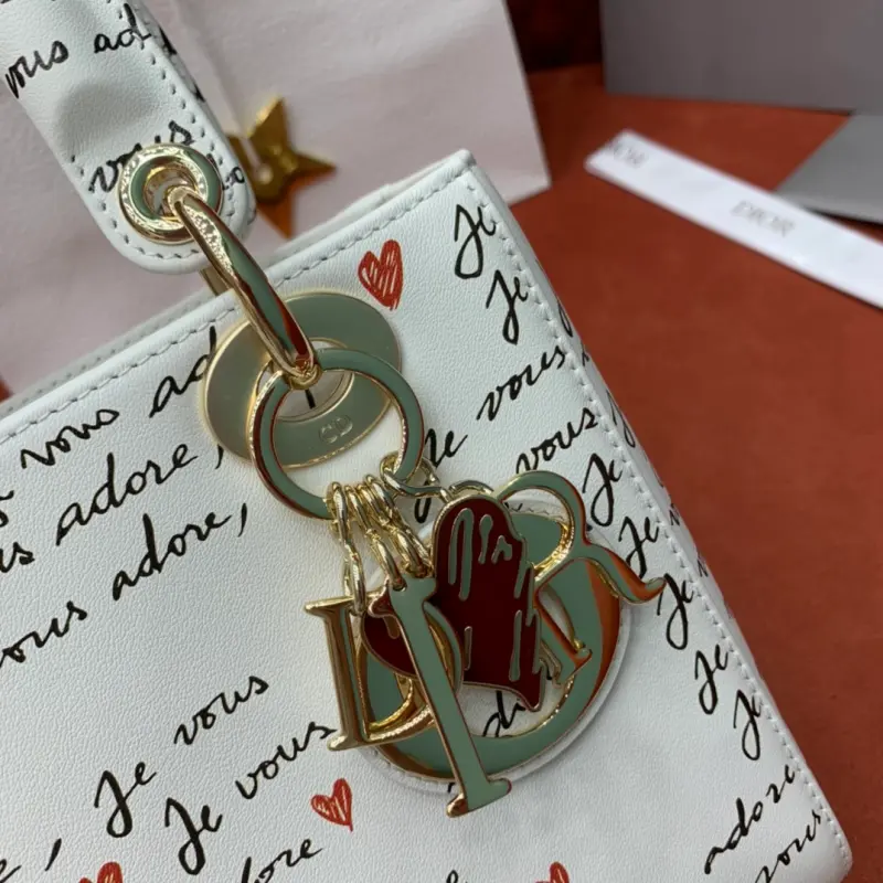 The Dbagamour Chinese Valentine’s Day limited edition collection embodies Dbag’s profound insight into elegance and beauty. The style is refined and elegant, carefully crafted from white cowhide leather and decorated with a black and red Je Vous Adore (I Love You) pattern, inspired by Marc Bohan’s Dbag design archive. The light gold-finished metal DI OR charm is embellished with a red enamel heart charm, making it more refined. The small size style has a unique design, and the shoulder strap can be decorated with a badge to show personality. It can be carried by hand or cross-body. It can also be easily matched with other Dbagamour items to create a matching look. The adjustable wide shoulder strap includes three badges for a personalized look. A total of six badges can be used for decoration. The internal zipper pocket and slip pocket can be matched with other Dbag embroidered shoulder straps. Dust bag included. Made in Italy. Dimensions: 20??17??8