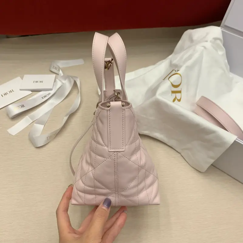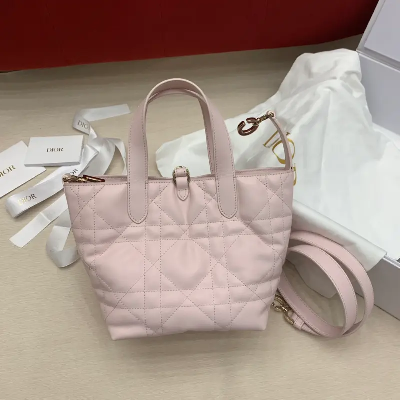 This small pink vertical version is a standout, adding a touch of style. Made from cowhide with a cowhide lining, it features oversized rattan-patterned stitching and spacious interior compartments for everyday essentials. It features a double closure: a slim Christian Dbag Paris strap with a CD Lock buckle, a Dbag charm, and an interior slip pocket for cards. The top leather handles feature a detachable leather shoulder strap for hand, shoulder, or crossbody carry. Dimensions: 16x18x12cm