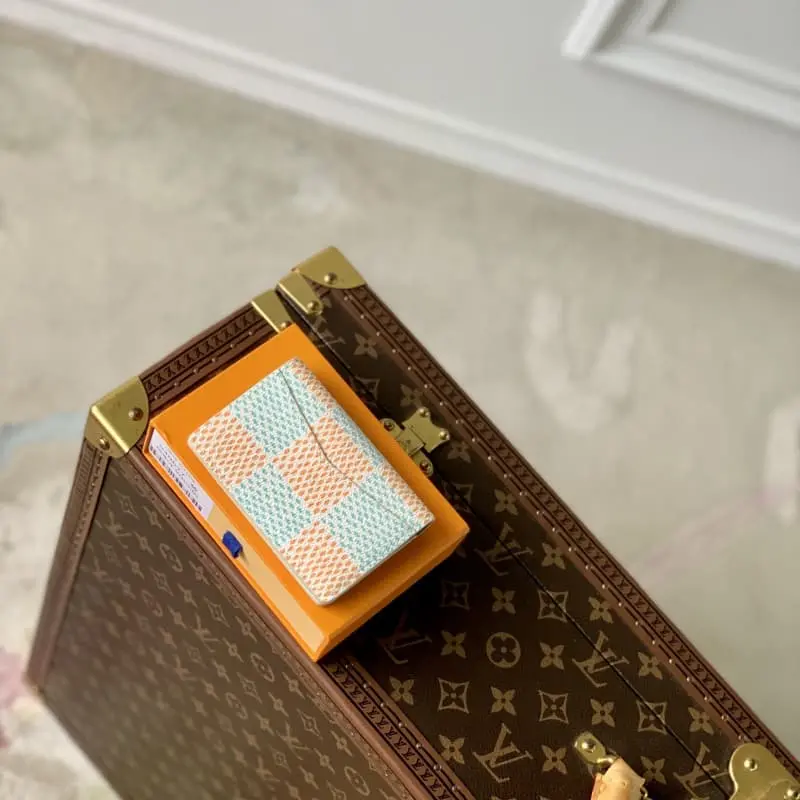 N40678 Green This Damier Heritage canvas pocket organizer has an oversized pattern with the words “Marque L. Vuitton D??pos??e” in the middle. The style of the Damier tile was inspired by the original finish of the pattern. This small wallet has three slots for cards, five inner pockets and one outer pocket. 7.5 x 11.1 x 1 cm