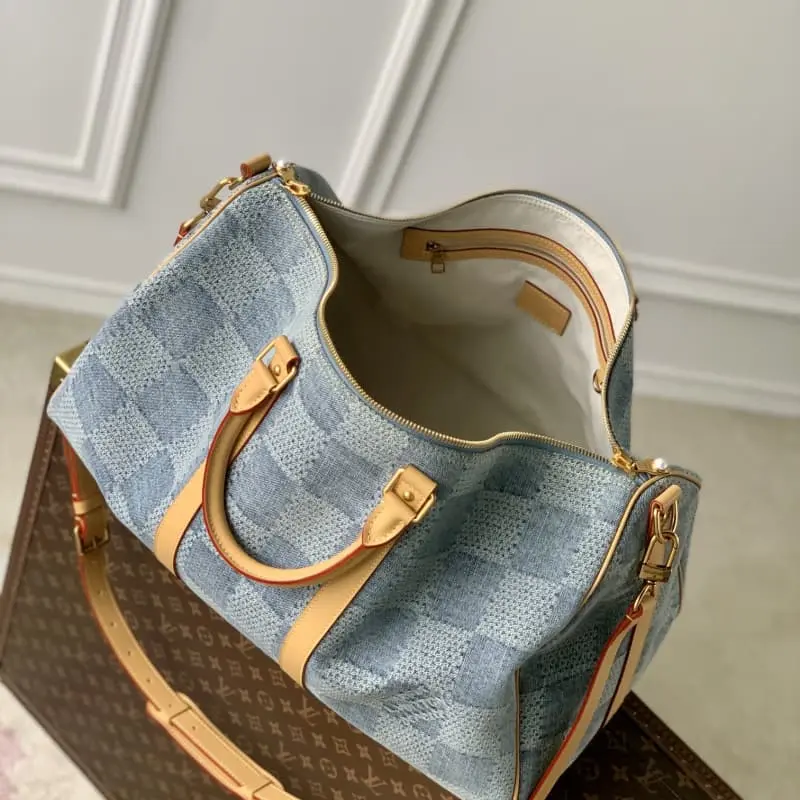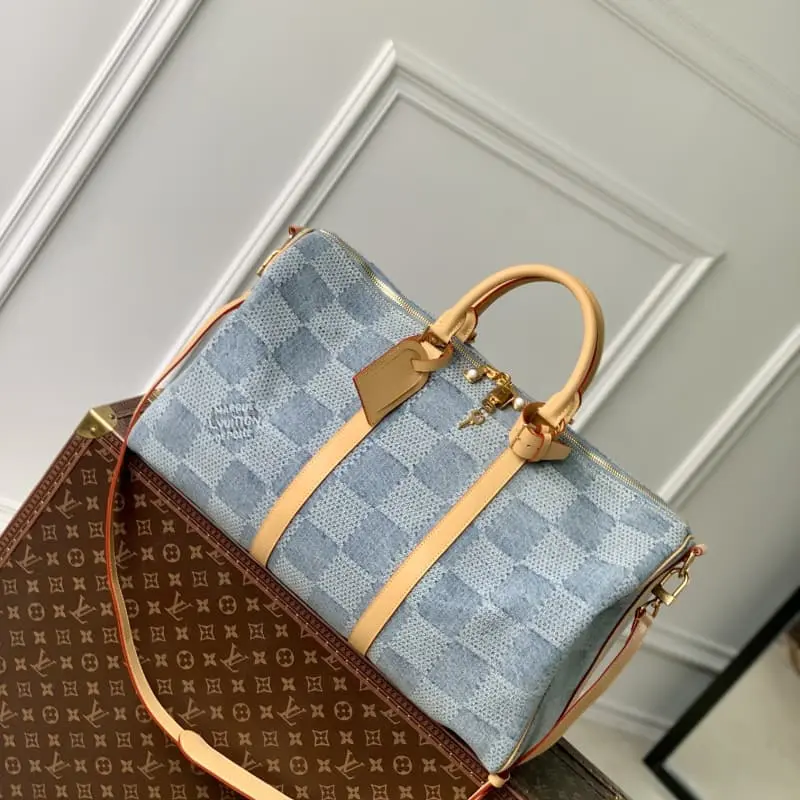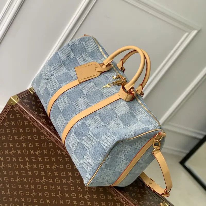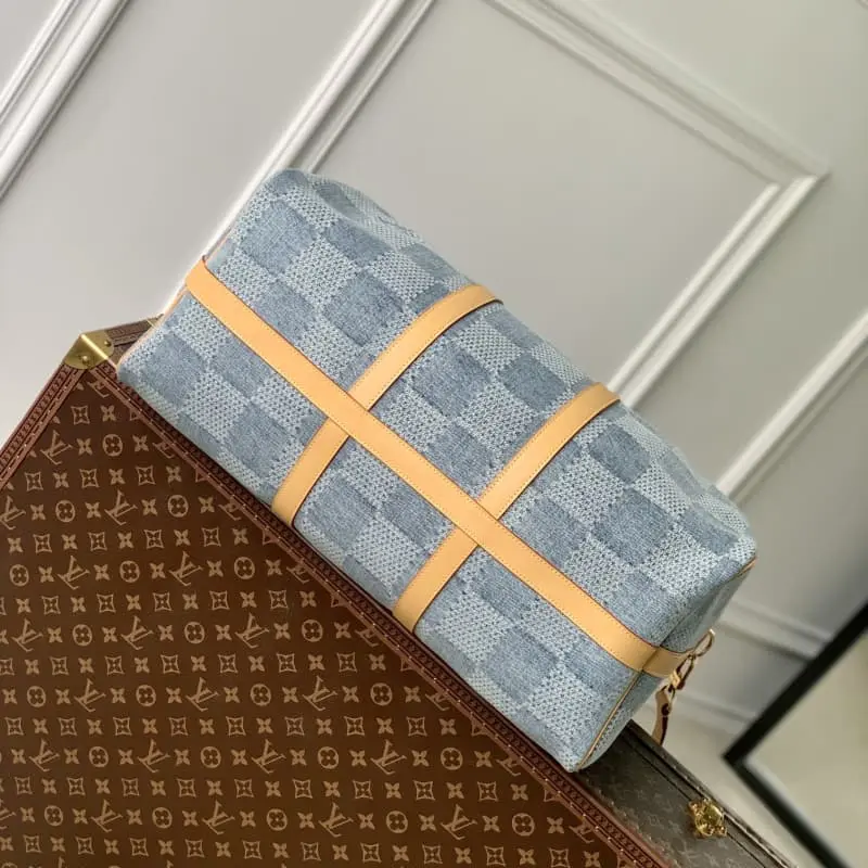 N40739 This Keepall Bandouli??re 50 travel bag exudes summer vibes in Damier Denim 3D cotton canvas. The cotton is carefully cut, bleached, dyed, rewashed and miniaturized to create a faded and three-dimensional effect. The zipper pull is embellished with lustrous beads. 50 x 29 x 23 cm (length x height x width)
