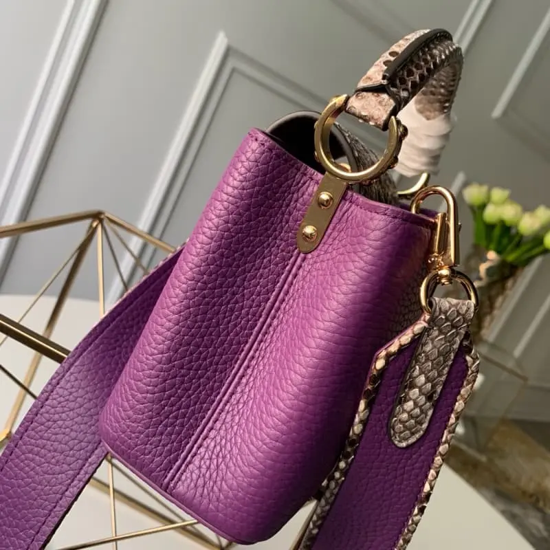 CAP MiNi N95509 Purple This Capucines handbag is made of python skin to embellish the timeless black Taurillon leather. The exotic python pattern wraps the Lu letter logo. The corner handle is fixed with a ring and decorated with gold studs. Imported lychee-grained cowhide with pure fetal cowhide lining. Original all-steel brushed hardware! Size 21x14x8cm